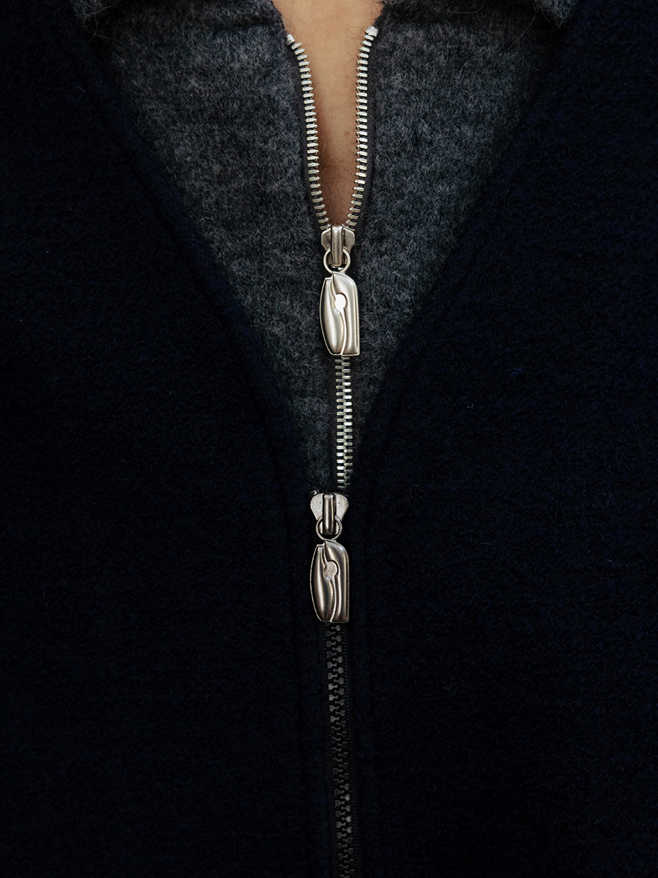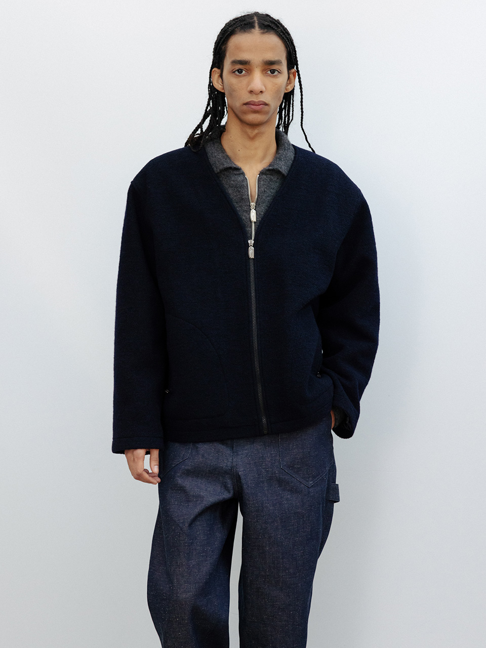 특유의 요철감이 돋보이는 울 블랜드 부클 원단으로 제작한 점퍼입니다. 오버사이즈 실루엣의 브이넥 점퍼 디자인으로, 프론트에 개발한 심볼로고 슬라이더와 포켓 스티치로 포인트를 주었습니다. 고급스러운 트윌 조직의 안감으로 라이닝 처리하였으며 라벨판에 부드러운 플리스 원단을 배색으로 매치하였습니다. 46어깨 55CM 가슴 65CM 총장 68.5CM 밑단 63CM 소매 60CM 48어깨 57CM 가슴 67.5CM 총장 69.5CM 밑단 65.5CM 소매 61CM 50어깨 59CM 가슴 70CM 총장 70.5CM 밑단 68CM 소매 62CM 치수는 재는 위치에 따라 1-3cm 차이 생길 수 있습니다. 어두운 원단은 염색되었기 때문에 밝은 아이템과 착용 시 주의 부탁드립니다. DRY CLEAN ONLY 182 마른 체형 모델 (48 사이즈 착용)