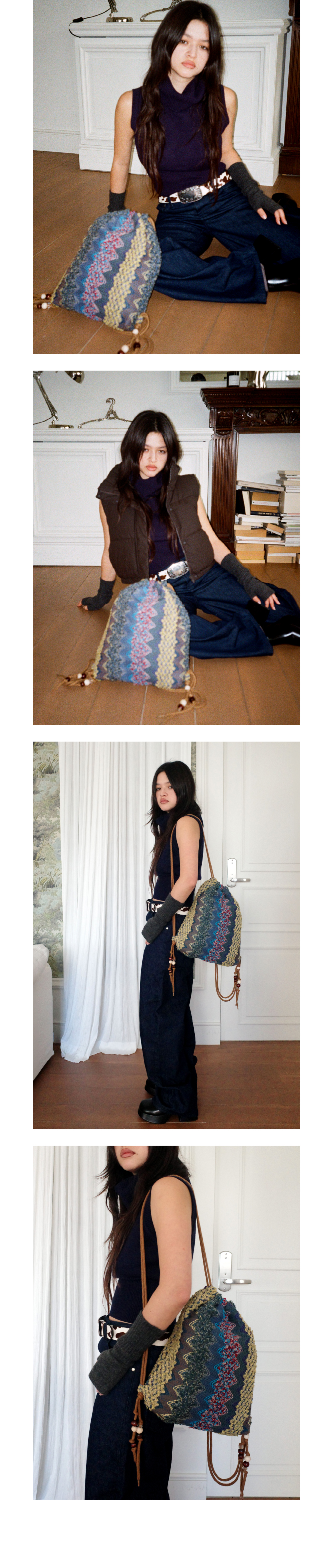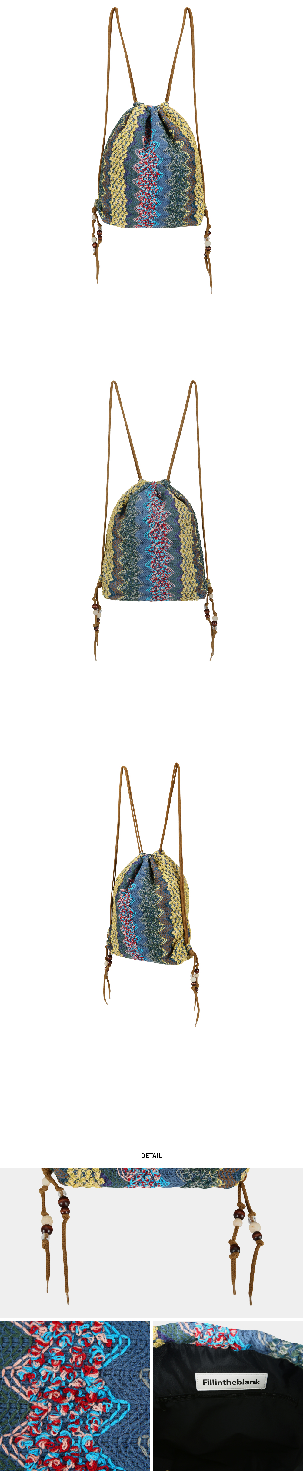 배터리 짐 색 Battery Gym Sack 니트 자카드 소재를 활용한 미들 사이즈 짐 백. · 제품 컬러별로 다르게 배색한 로프 스트랩 · DIY 형식으로 커스텀 가능한 비즈 장식 · 내부 지퍼 포켓과 가죽 로고 라벨로 마감