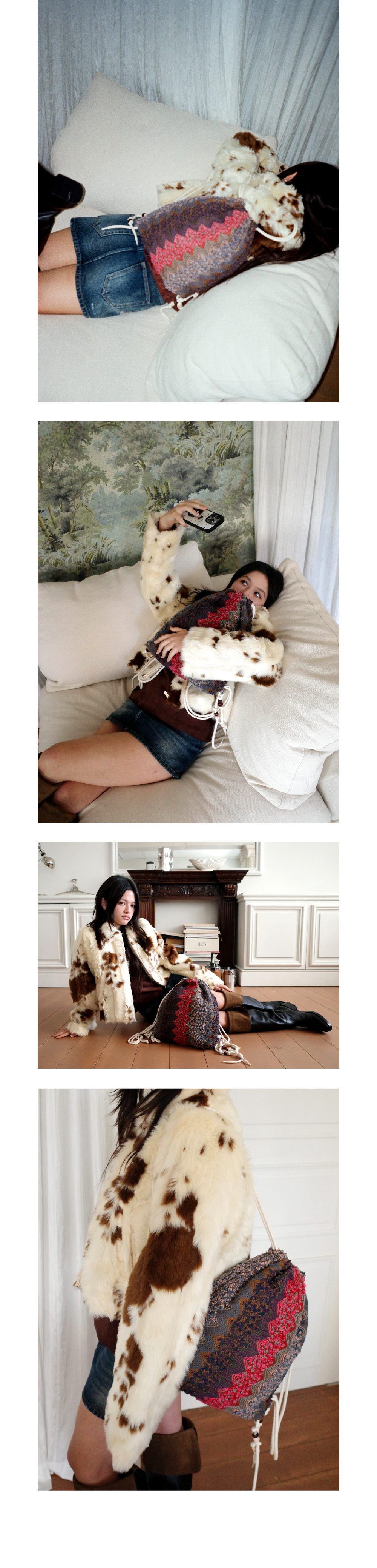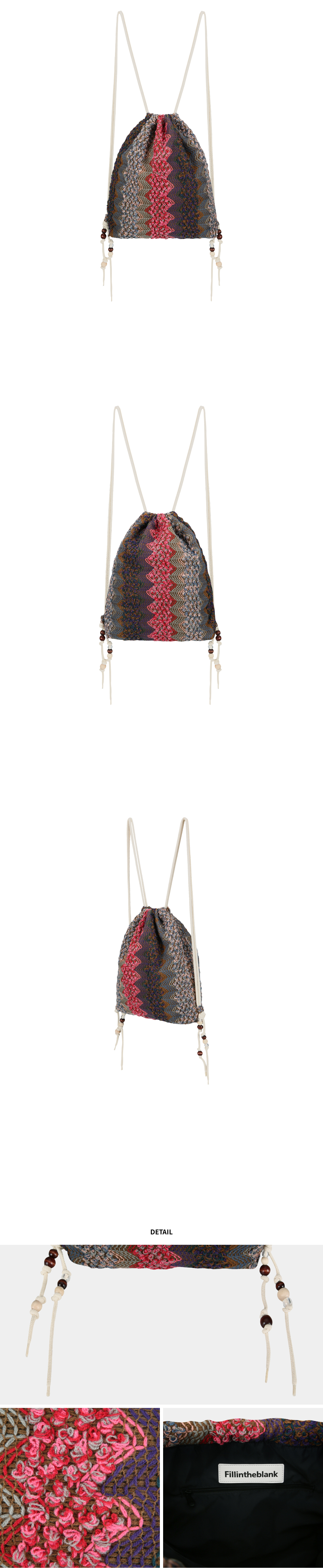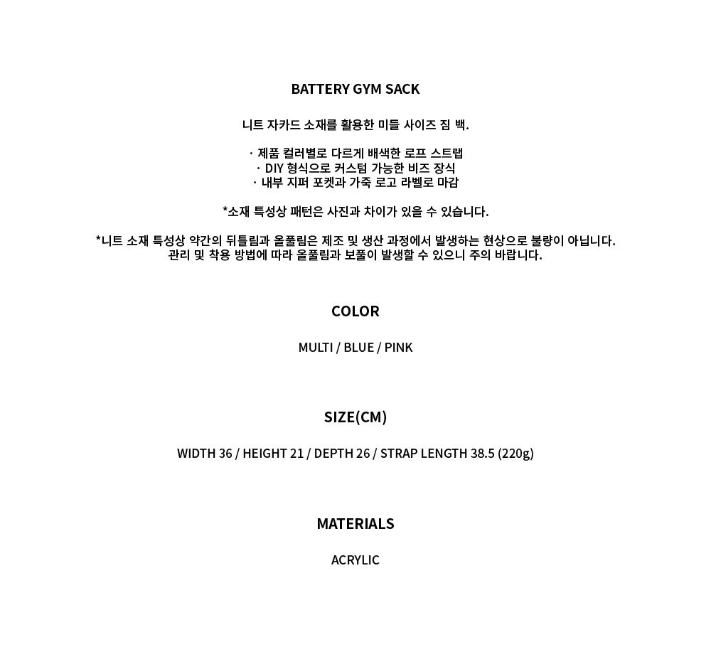 배터리 짐 색 Battery Gym Sack 니트 자카드 소재를 활용한 미들 사이즈 짐 백. · 제품 컬러별로 다르게 배색한 로프 스트랩 · DIY 형식으로 커스텀 가능한 비즈 장식 · 내부 지퍼 포켓과 가죽 로고 라벨로 마감