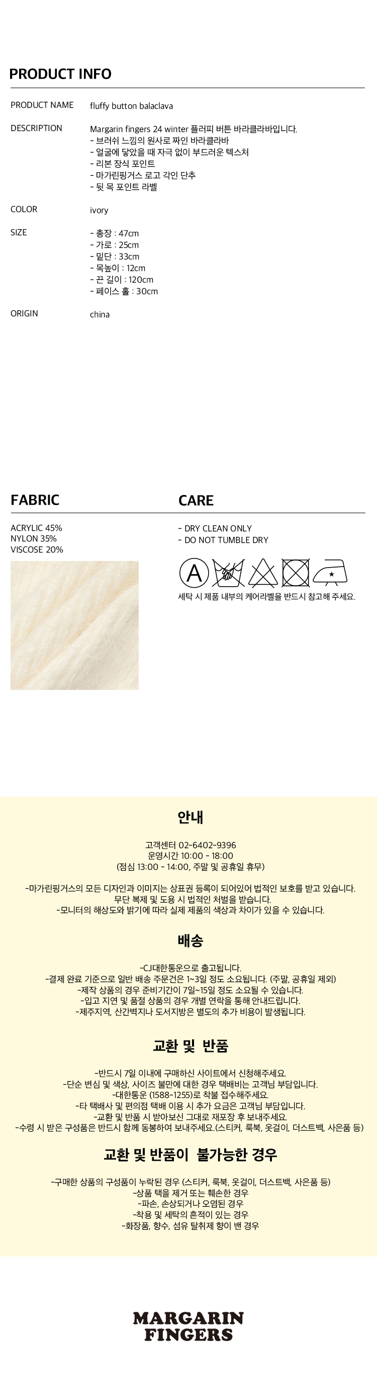 [예약 배송] 마가린핑거스 플러피 버튼 바라클라바 아이보리
