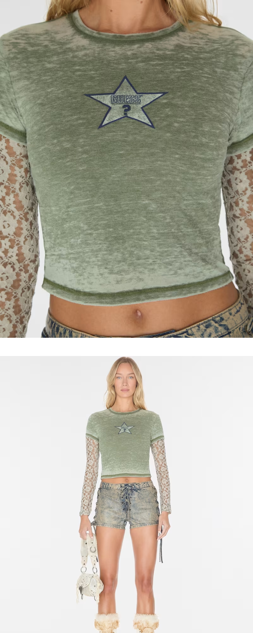 Guess USA Women Vintage Layered Lace Tee Washed Out Green - 24FW