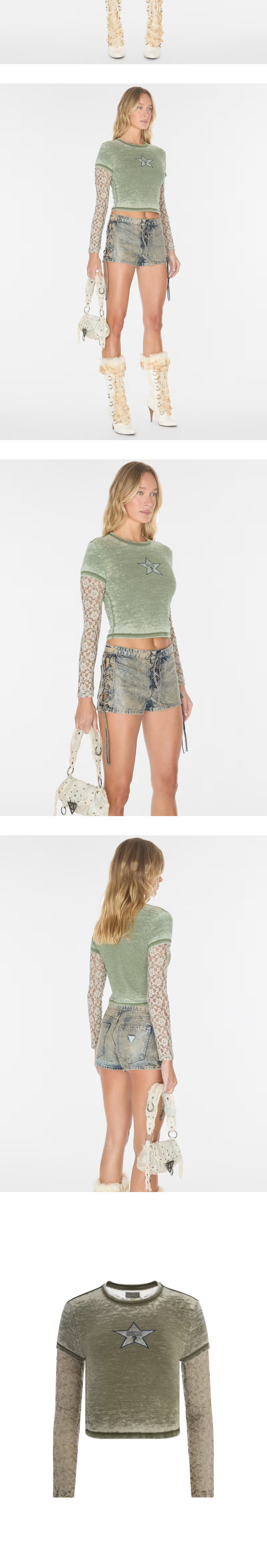 게스 USA 우먼 빈티지 레이어드 레이스 티 워시드 아웃 그린 - 24FW