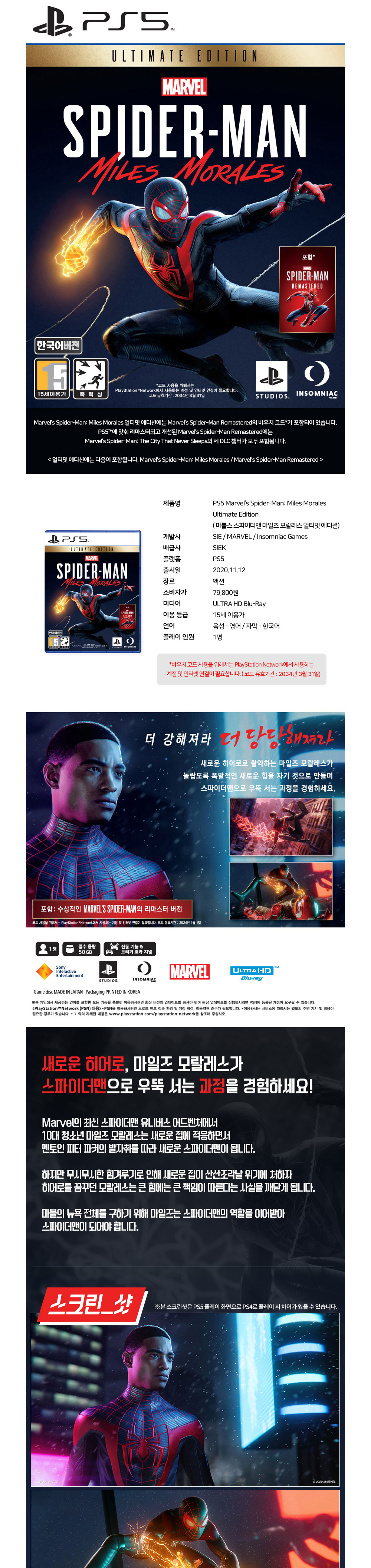 플레이스테이션 5 마블 스파이더맨 마일즈 모랄레스 얼티밋 에디션