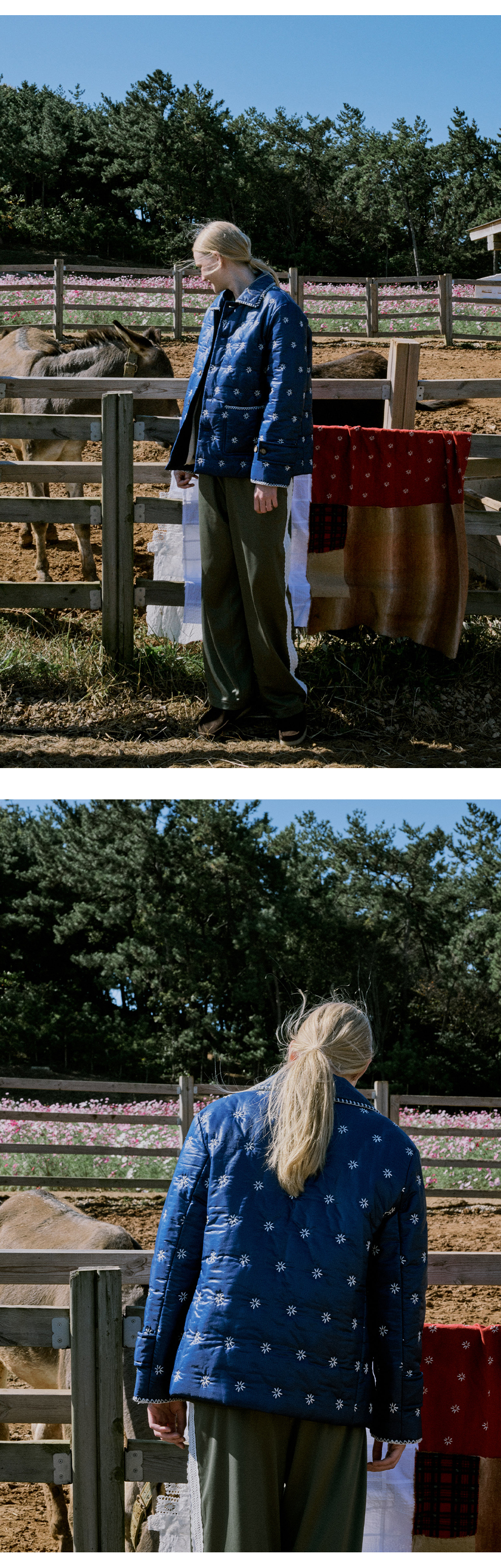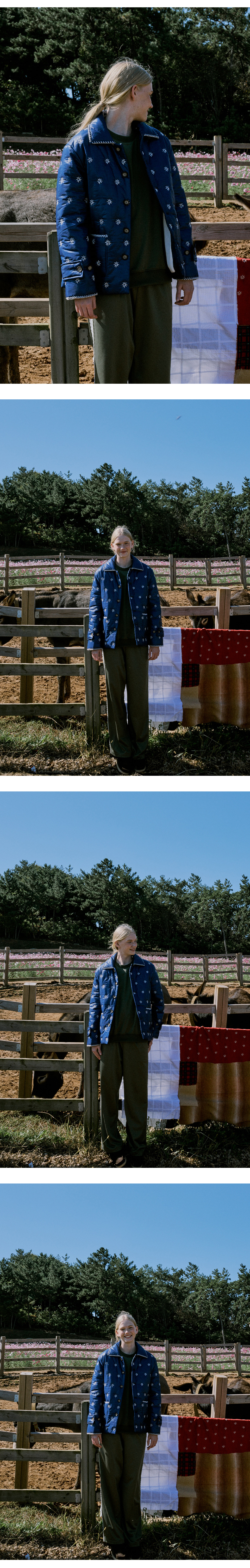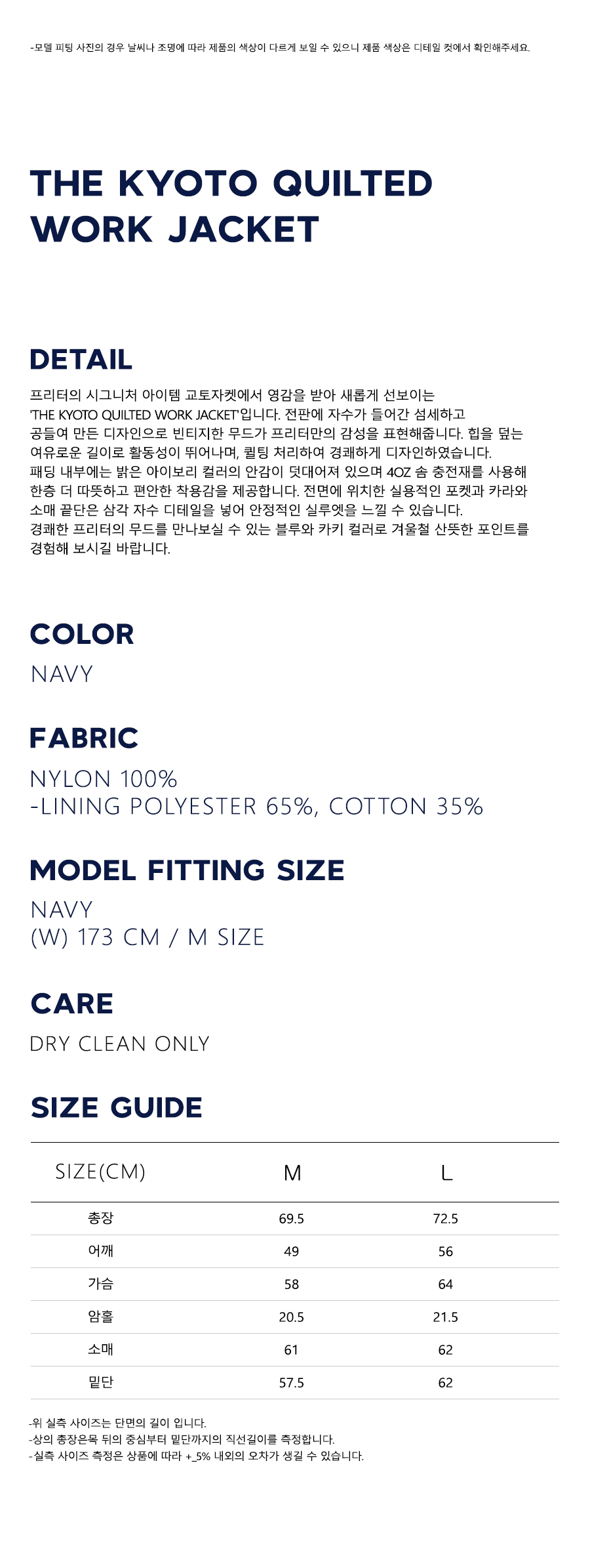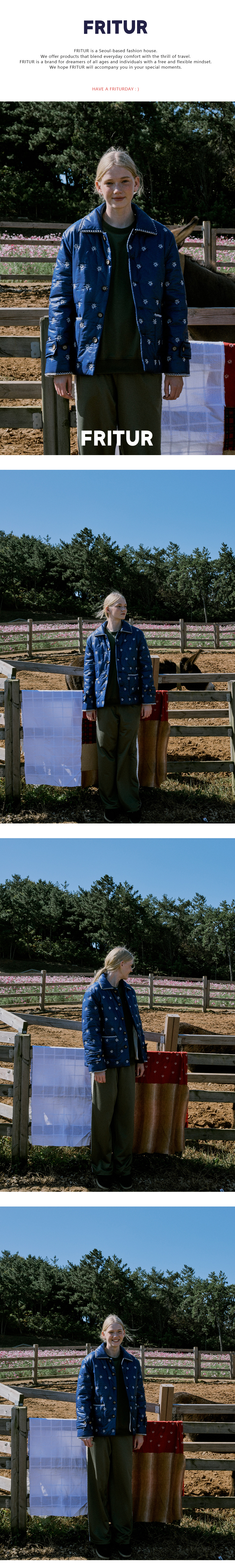 프리터의 시그니처 아이템 교토자켓에서 영감을 받아 새롭게 선보이는 'KYOTO Quilted Work Jacket'입니다. 전판에 자수가 들어간 섬세하고 공들여 만든 디자인으로 빈티지한 무드가 프리터만의 감성을 표현해줍니다.힙을 덮는 여유로운 길이로 활동성이 뛰어나며, 퀼팅 처리하여 경쾌하게 디자인하였습니다. 패딩 내부에는 밝은 아이보리 컬러의 안감이 덧대어져 있으며 4oz 솜 충전재를 사용해 한층 더 따뜻하고 편안한 착용감을 제공합니다. 전면에 위치한 실용적인 포켓과 카라와 소매 끝단은 삼각 자수 디테일을 넣어 안정적인 실루엣을 느낄 수 있습니다. 경쾌한 프리터의 무드를 만나보실 수 있는 블루와 카키 컬러로 겨울철 산뜻한 포인트를 경험해 보시길 바랍니다.