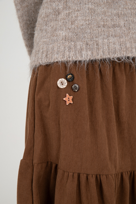 빈티지한 단추로 포인트를 준 러블리한 핏의 롱스커트 입니다. 단독으로도, 레이어드로도 이쁘고 편안하게 입으실 수 있도록 디자인 했습니다. 다양한 체형에 어울릴수 있는 프리사이즈로 디자인 했습니다. 어떤 신발과 매치해도 자연스러운 코듀로이 스커트입니다. 가벼운 무게감으로 어디에도 편안하게 착용이 가능합니다.