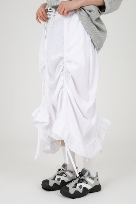 길이 조절이 가능한 셔링 스트링 디테일로 다양한 연출이 가능한 롱스커트 입니다. 단독으로도, 레이어드로도 이쁘게 입으실 수 있도록 디자인 했습니다. 다양한 체형에 어울릴수 있는 프리사이즈로 디자인 했습니다. 밑단에 프릴, 셔링으로 트렌디한 디테일을 넣었습니다. 화이트 색상의 경우 비침을 최소화 하기위해 안감을 넣었습니다.