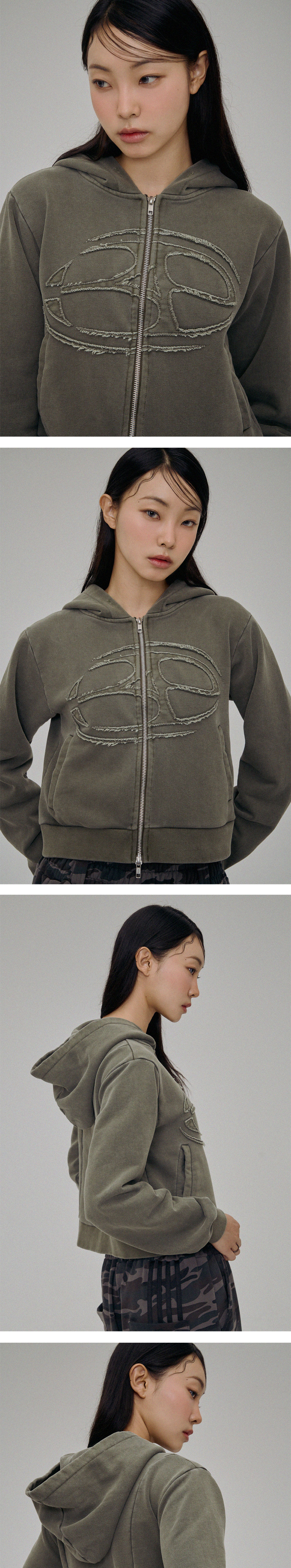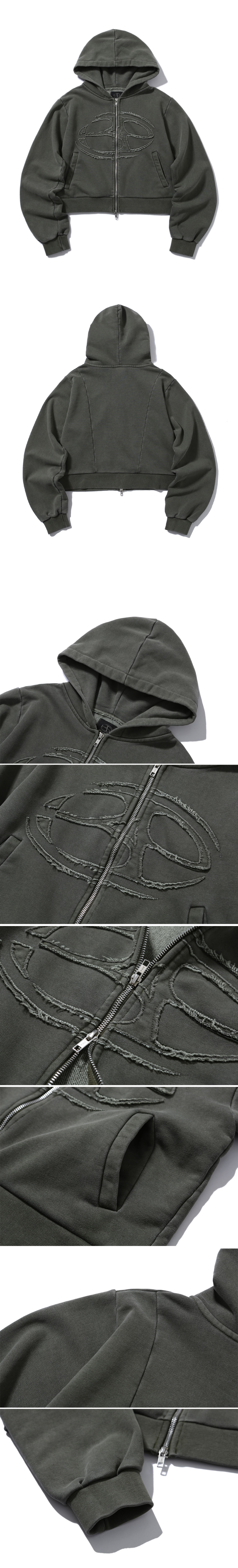 비피투디스오더 어드밴스트 피그먼트 심볼 로고 크롭 후드집업 카키