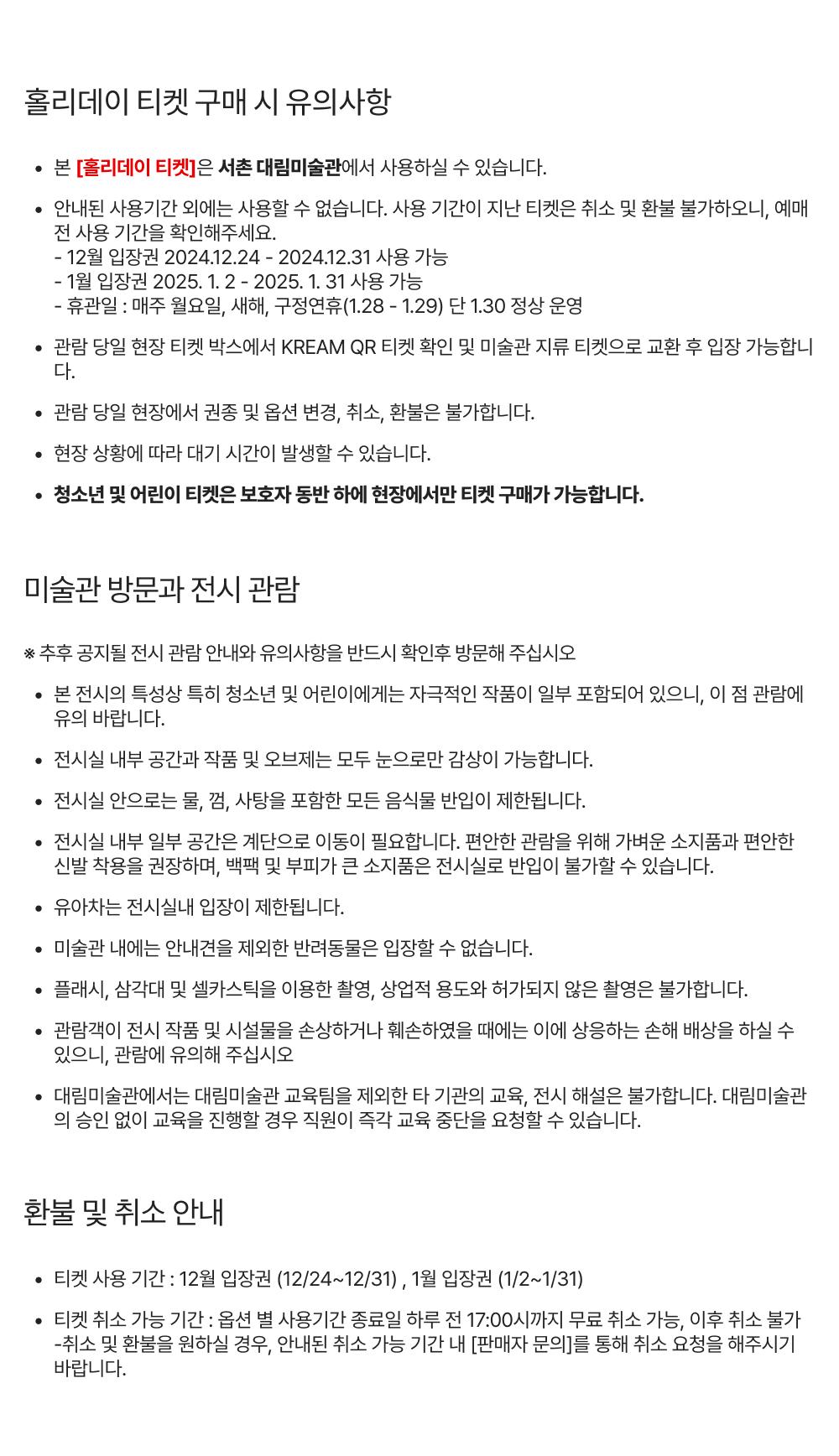 - 티켓은 선택한 옵션 내 안내된 기간에 사용 가능 - 본 티켓은 서촌 대림미술관에서 사용할 수 있는 성인 전시입장권 입니다. (청소년 및 어린이 전시입장권은 보호자 동반 하에 현장에서 구입 가능합니다) - 티켓 취소 가능 시간 : 선택한 옵션별 사용 기간 종료일 하루 전 17:00시까지 미사용 티켓에 한해 무료 취소 가능, 이후 취소 및 환불 불가 - 관람시간 : 화,수,목,일 11:00~19:00 / 금,토 11:00~20:00 (입장마감 : 관람시간 종료 1시간 전) - 매주 월요일 휴관, 신정(1/1), 구정연휴 휴관(1/28~1/29),1/30 정상 운영