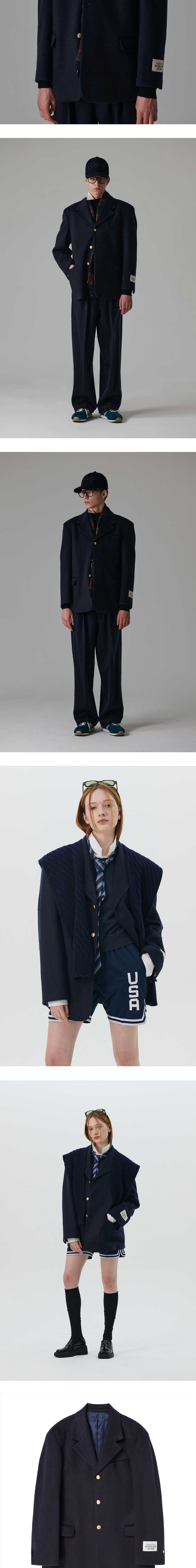 ㆍ일본산 울과 코튼 저지 소재를 합포한 유니크한 원단으로 제작 ㆍ세미 오버핏으로 자연스럽고 클래식한 실루엣 연출 ㆍ라펠 안쪽 플라워 홀 자수 디테일 ㆍ오리지널 테일러링으로 뛰어난 퀄리티와 내구성 ㆍ22K 골드 도금된 고퀄리티의 단추 사용 ㆍ카라 안쪽 울 펠트 디테일 ㆍ내구성과 터치감이 우수한 큐프릭 원단 사용 ㆍ소매 핸드메이드 스탬프 라벨 ㆍ남녀공용 착용 ㆍ여성분들은 M사이즈 착용 권장