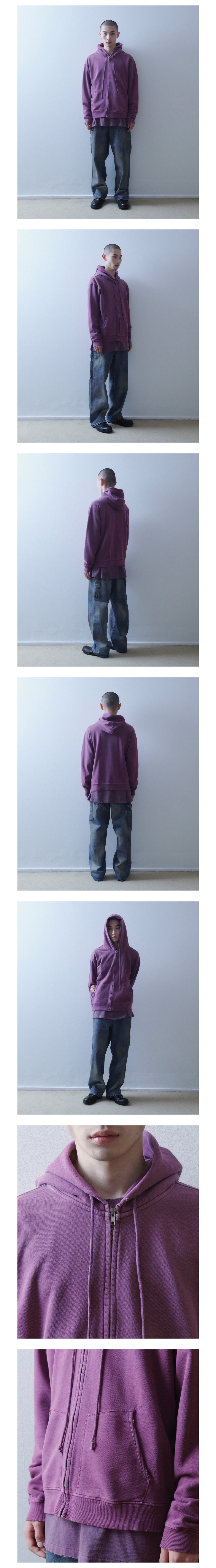 No. AY-CT12 세미오버 실루엣의 가먼트 다잉 후디 집업 입니다. 코마사로 짜여진 면 100% 원단으로 530g 중량의 무겁지 않은 원단을 사용하였습니다. 보다 자연스러운 실루엣을 위해 기모가 없는 원단으로 사용하였습니다. 전체적인 봉제 마감은 가이루빠로 마감하였으며 캥거루 포켓 형태와 입구 마감처리를 달리 함으로써 재미를 더하였습니다. 소매와 몸통 시보리 끝단에 데미지 가공을 수작업으로 한 후 가먼트 다잉을 거쳐 자연스러운 데미지를 구현했습니다. 어깨와 후드 주변을 스프레이로 은은하게 탈색시켜 유즈드한 느낌을 더 하였고 설파 염료로 가먼트 다잉하여 입을수록 에이징되어 가는 경년 변화를 즐기실 수 있습니다. MADE IN KOREA MODEL 179cm Wearing Size 3 Color Purple Material Cotton 100%