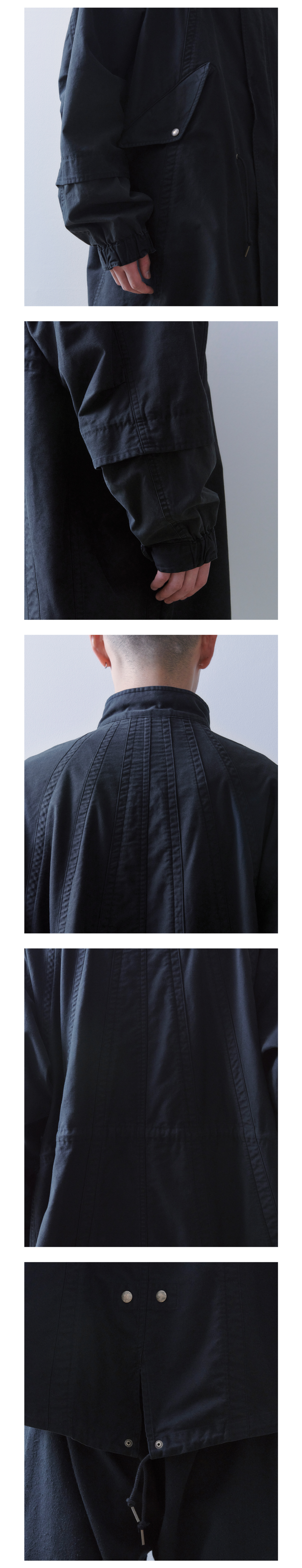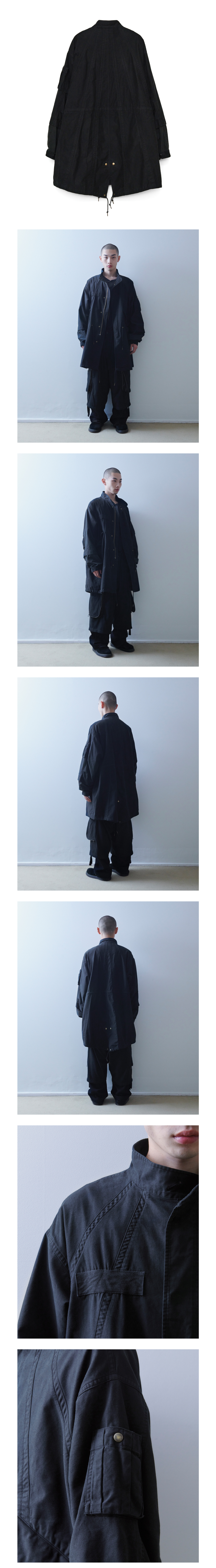 No. AY-JK07 여유있는 오버사이즈 실루엣의 피쉬테일 파카입니다. 메인 원단으로 COSMO 社의 몰스킨 밀리터리 소재를 사용하였으며 소매 부리 원단은 One-Any 社의 뚜렷한 텍스쳐감의 고밀도 트윌 원단을 톤 온 톤으로하여 사용하였습니다. 워싱을 통해 생기는 퍼커링을 더욱 부각시키기 위해 앞,뒤 몸판에 사선으로 뻗쳐나가는 절개를 주었고 봉제 또한 더블 스티치가 아닌 점차 간격이 넓어지도록 마감하여 안정적인 밸런스로 잡았습니다. 소맷 부리에 플랩 디테일은 소매단에서 접혀 올라오는 주름과 잘 어우러지며 좌측 소매에 아웃 포켓을 넣어 포인트를 주었습니다. 스냅은 워싱 전에 작업하여 거친 표면감을 의도하였습니다. MADE IN KOREA MODEL 179cm Wearing Size OS Color Black Material Shell : Cotton 100% (COSMO社 Japanese Fabric) Partly : Cotton 100% (ONE ANY社 Japanese Fabric)