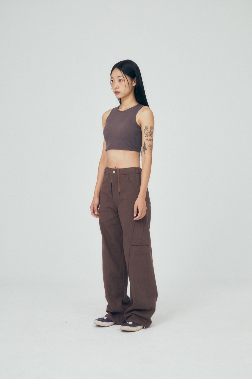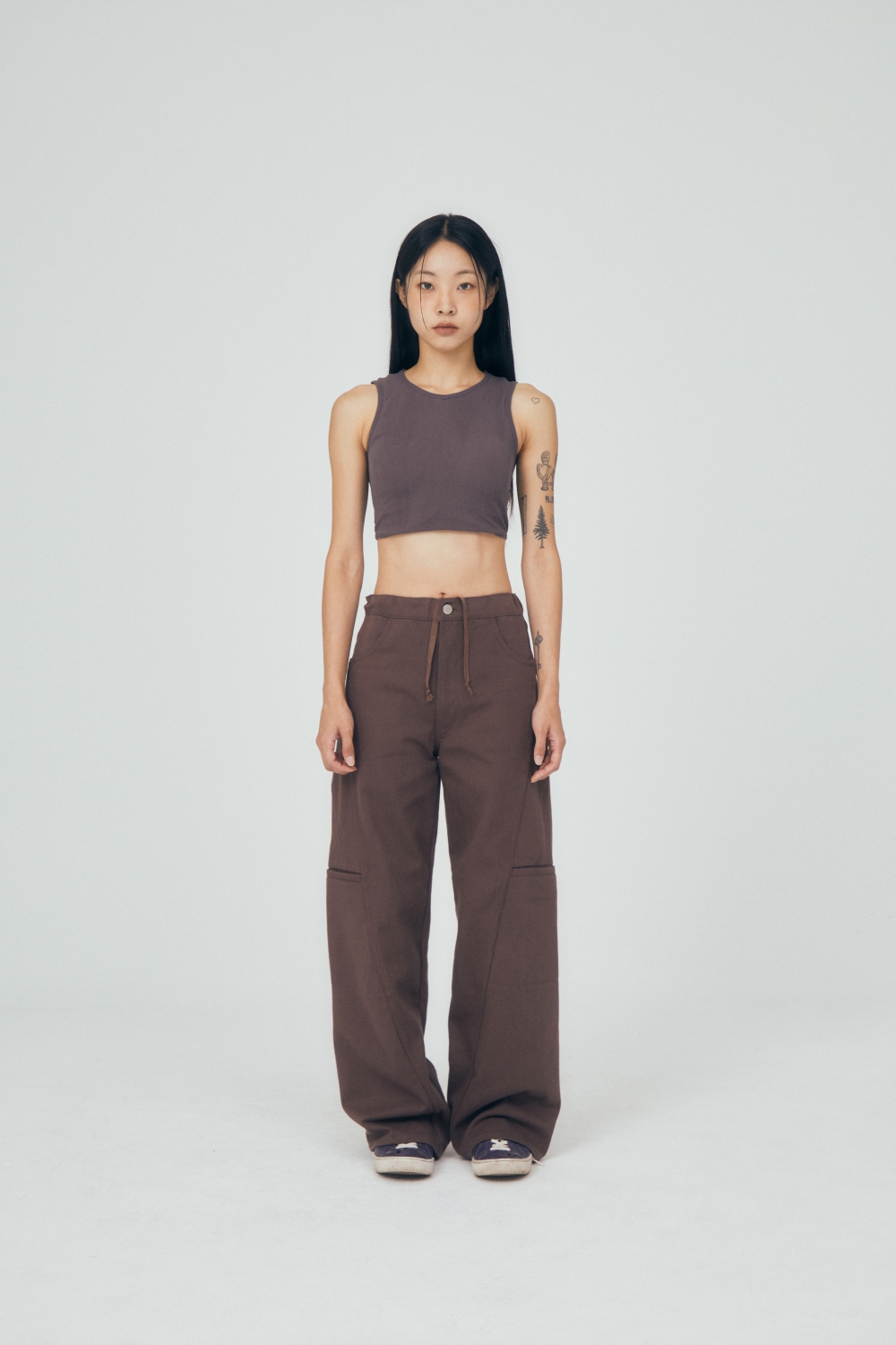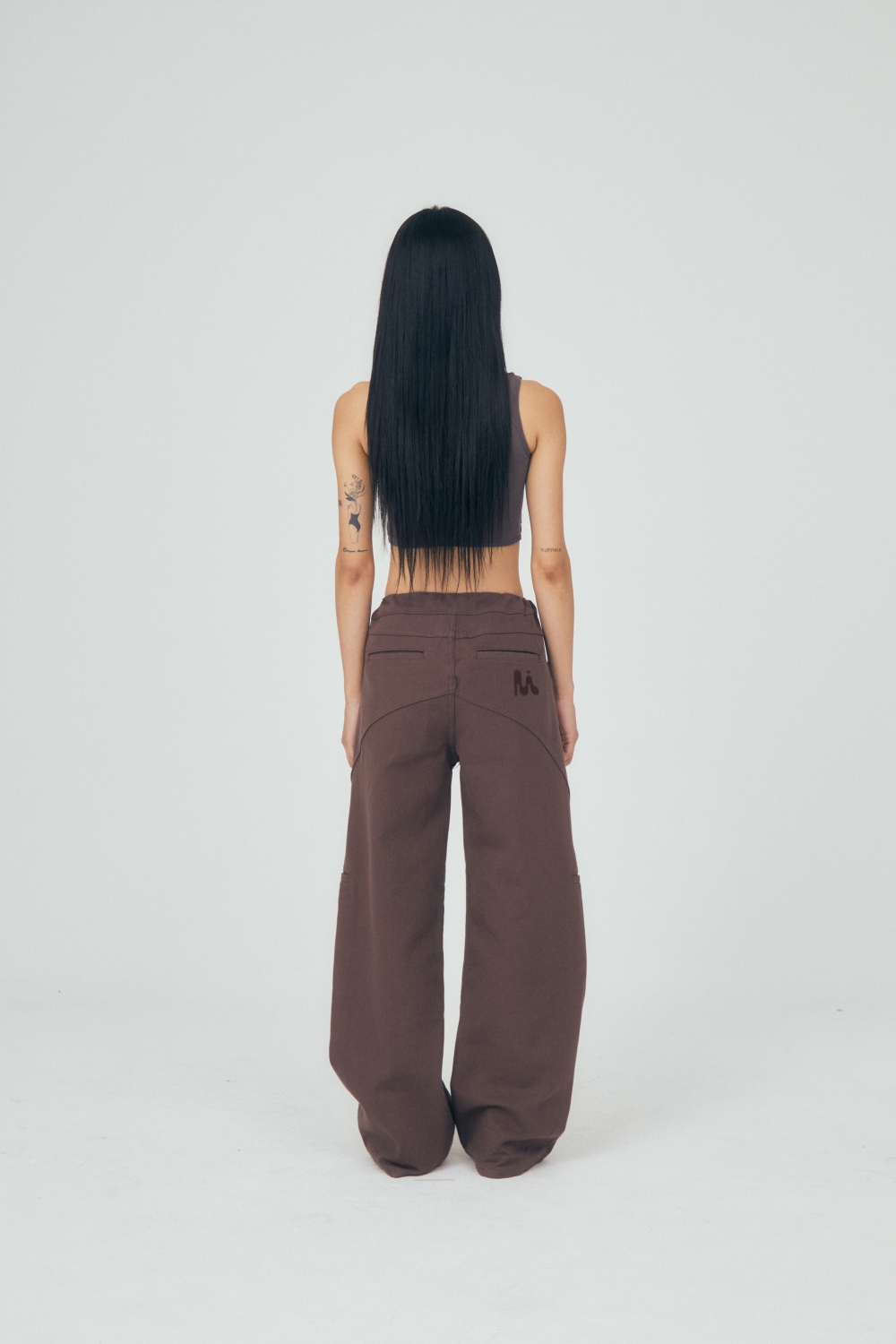 유연한 커브 실루엣이 매력적인 코튼팬츠입니다. 박음을 둥글게 잡아 전체적인 실루엣을 풍성하면서도 튼튼하게 잡았습니다. 허리에 내장된 스트링을 이용하여 사이즈 조절이 가능합니다. 후면 미와이후 자수 로고가 은은하게 들어가있습니다.