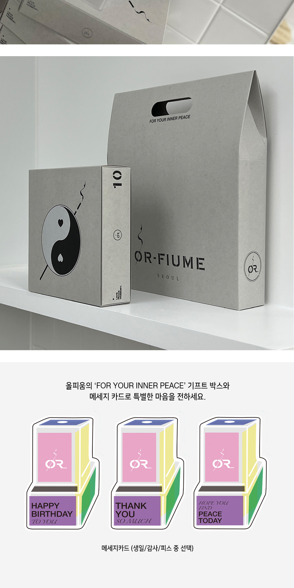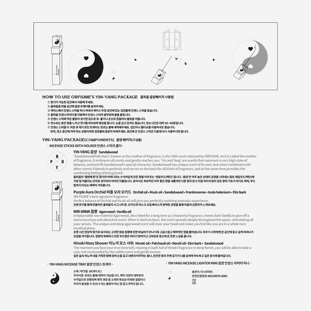 OR-FIUME SEOUL SINCE 2018 올피움은 인센스 스틱을 제조합니다. 수십 년의 세월이 깃든 향방 장인의 엄격한 공정을 통해 국내에서 100% 제작된 고밀도 인센스 스틱입니다. 침향, 백단, 유향, 회향, 목향, 느릅나무껍질 등을 분쇄합니다. 재료들을 반죽한 후 인센스 스틱 형태로 제조합니다. 자연 건조와 숙성 과정을 통해 올피움으로 탄생됩니다. 인센스 스틱 케이스의 뚜껑은 인센스 홀더로 활용 가능합니다. 45도, 90도, 180도 등 다양한 각도와 방법으로 언제 어디서든 편리하게 사용하세요. ■ 음양 패키지 : 음양(샌달우드), 퍼플 오라 오키드, 니르-바나(침향), 히노끼 모스 샤워 4가지 향x13스틱 음양 인센스 트레이 음양 인센스 라이터 미니 선물포장 & 메세지카드 (생일/감사/피스)