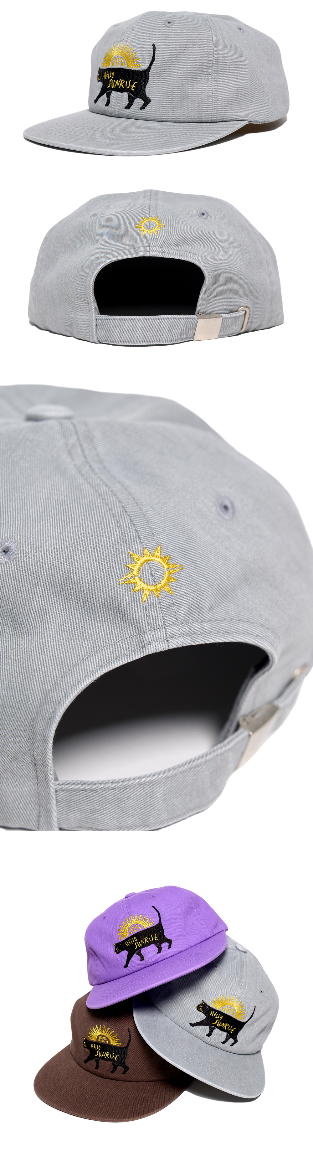 헬로선라이즈 캣 그래픽이 자수로 들어간 6패널 캡입니다. - 워싱 가공으로 빈티지한 무드 - 뒤판 Hello Sunrise 심볼 자수 처리 *모자의 챙을 개인적인 취향에 따라 원하시는 각도로 구부려 착용하시길 권장 드립니다. *모자의 챙이 워싱과정으로 살짝 삐뚤어져보이는 현상은 제품의 불량이 아니므로 반품사유가 되지 않습니다. * Cotton 100% Made in Korea