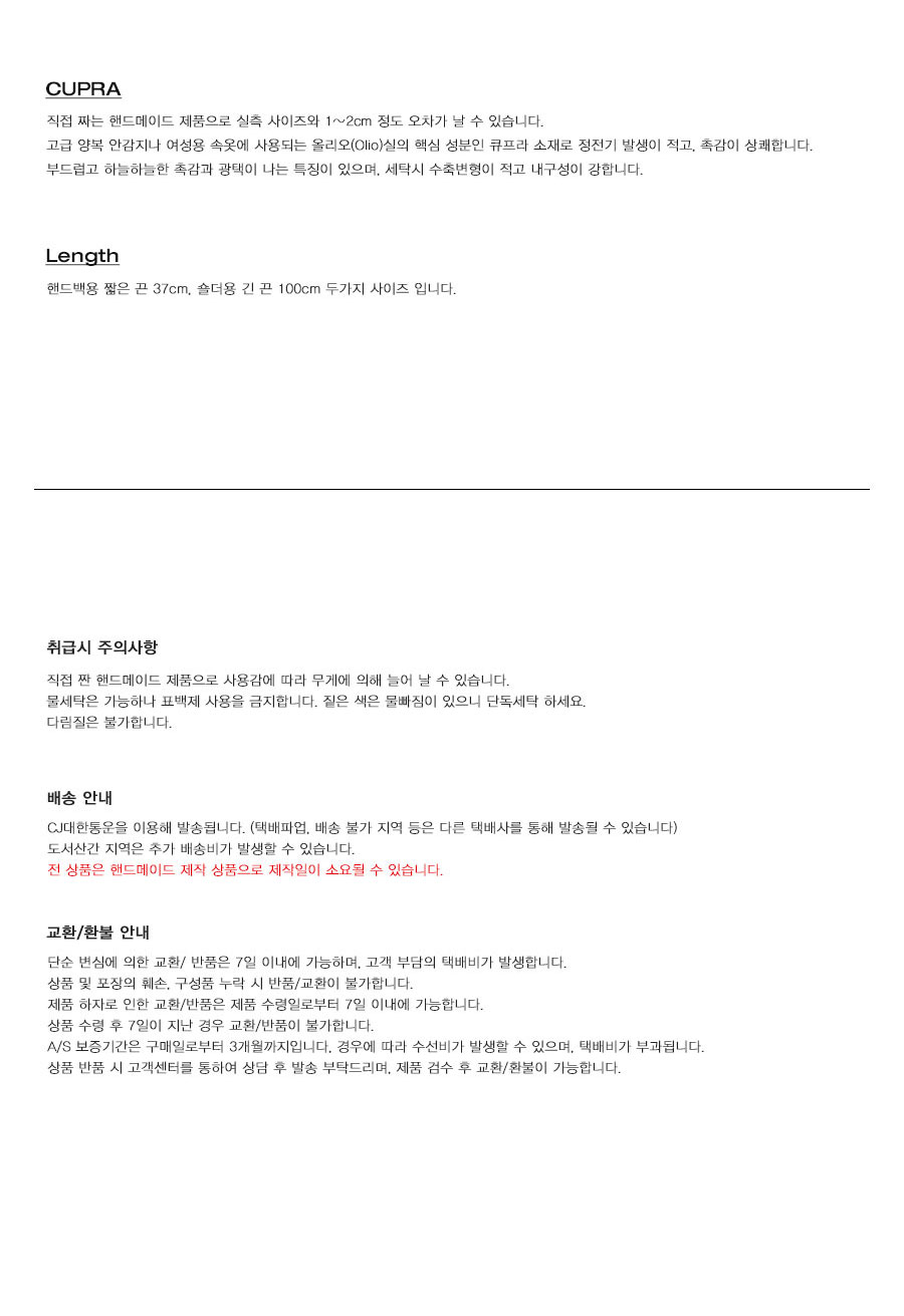 직접 짜는 핸드메이드 제품으로 실측 사이즈와 1~2cm 정도 오자가 날 수 있습니다. 고급 양복 안감지나 여성용 속옷에 사용되는 올리오(Olio)실의 핵심 성분인 큐프라 소재로 정전기 발생이 적고, 촉감이 상쾌합니다. 부드럽고 하늘하늘한 촉감과 광택이 나는 특징이 있으며, 세탁시 수축변형이 적고 내구성이 강합니다. 해당상품은 주문 후 제작 상품으로 제작 기간이 최대 14일 정도 소요 될 수 있습니다. 구매에 참고 부탁드리며 단순 변심으로 인한 환불 및 취소가 어려운 점 양해 부탁드립니다.
