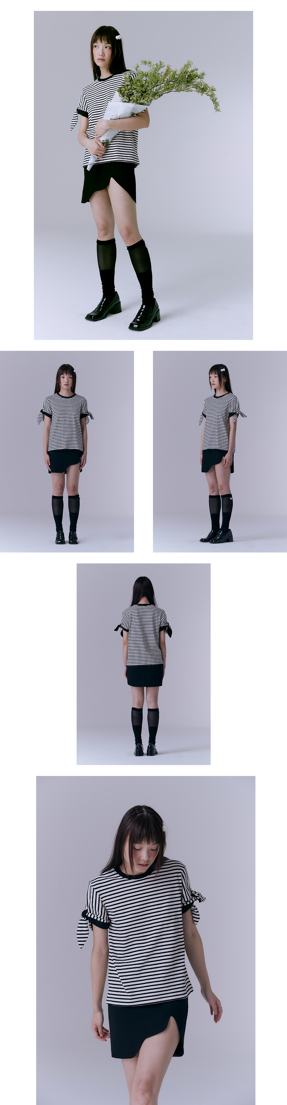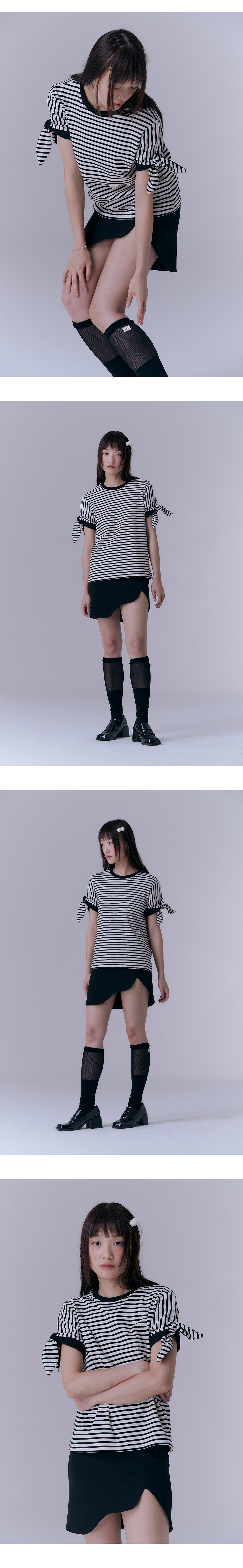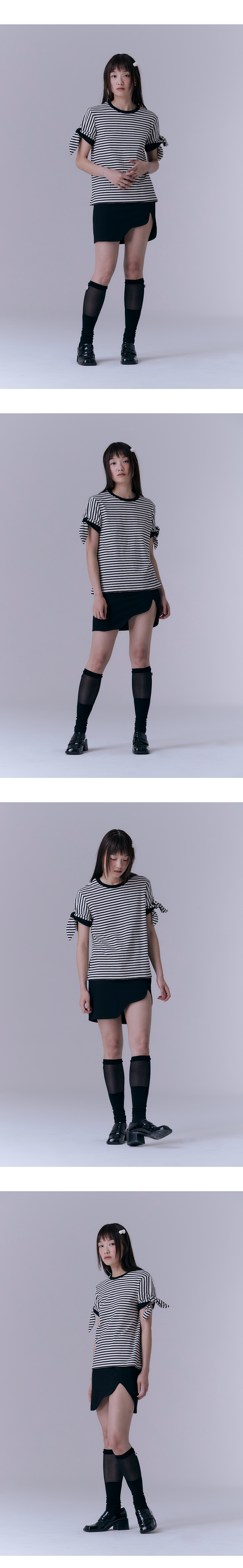 신축성이 좋은 원단을 사용하여 높은 탄력성과 편안한 착용감을 선사합니다. 밑단의 비대칭 실루엣이 돋보이는 미니스커트입니다. SEMI-HIGH WAIST 허리라인입니다.
