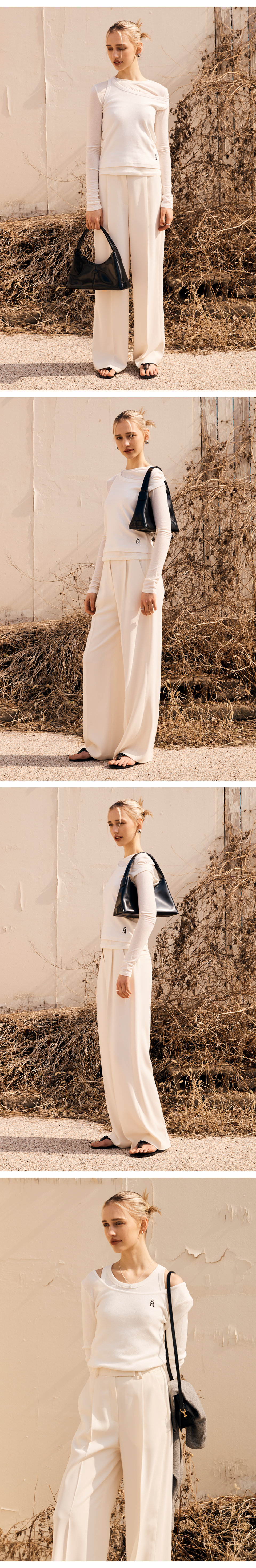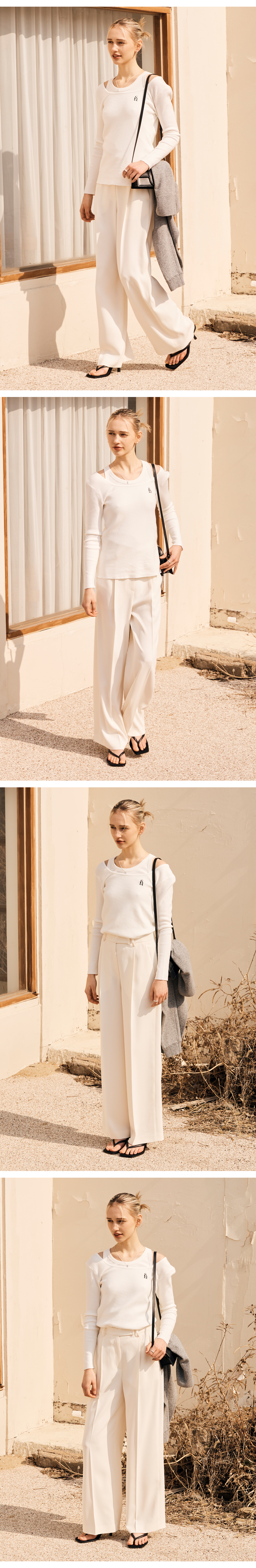 HIGH WAIST 와이드 팬츠. 허리 뒷부분에 밴드 디테일을 더하여 신축성을 높였습니다. 밴드 허리로 허리SIZE 착용범위가 넓습니다. 신축성이 높은 소재를 사용하였습니다.
