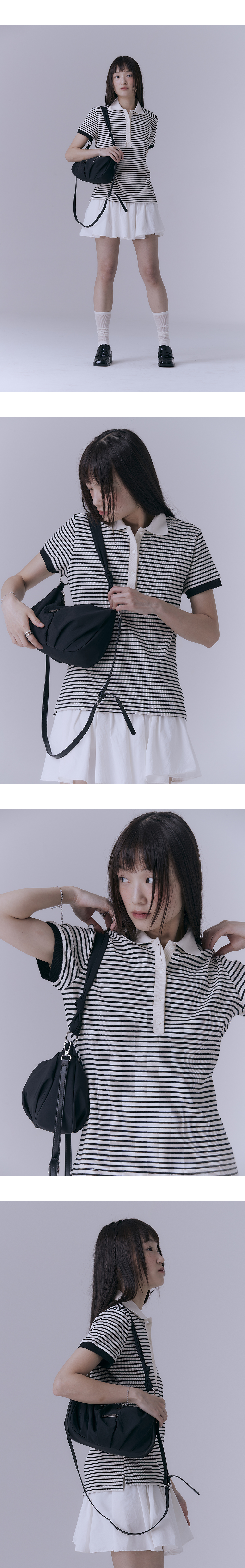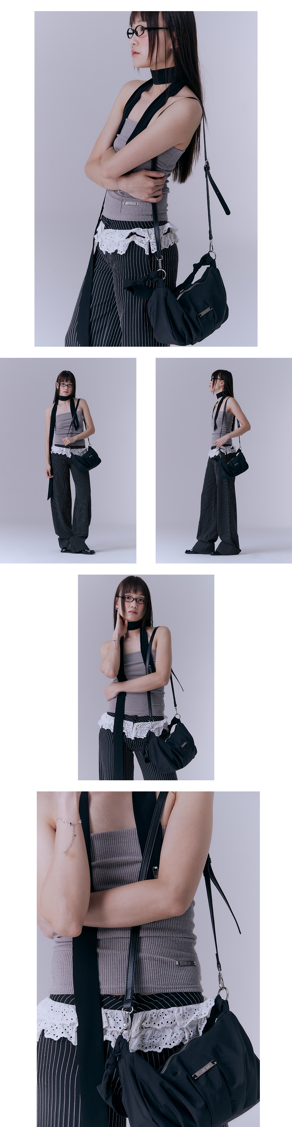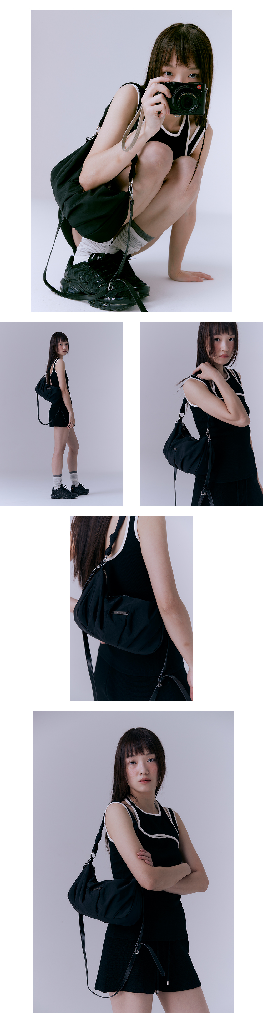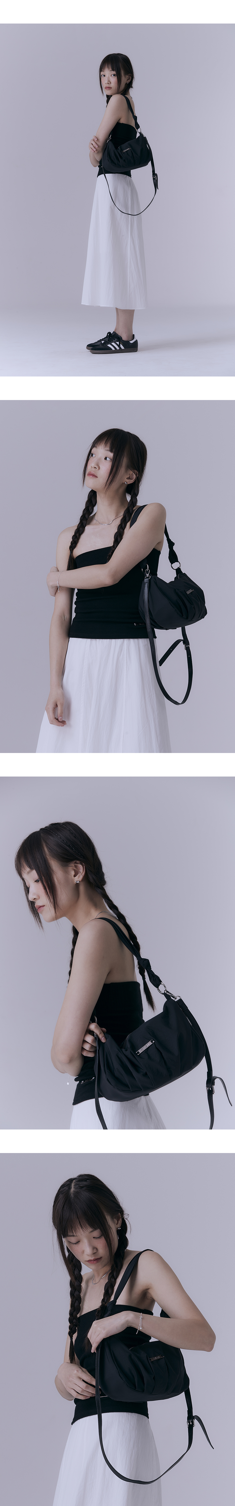 하단 셔링 디테일이 돋보이는 입체적인 호보백입니다. 짜임이 탄탄한 나일론 원단을 사용하였습니다. 조절과 탈부착이 가능한 긴 스트랩, 짧은 스트랩으로 구성되어 다양한 연출이 가능합니다. 내부에 작은 포켓이 있습니다. 금속 라벨로 포인트를 더하였습니다.
