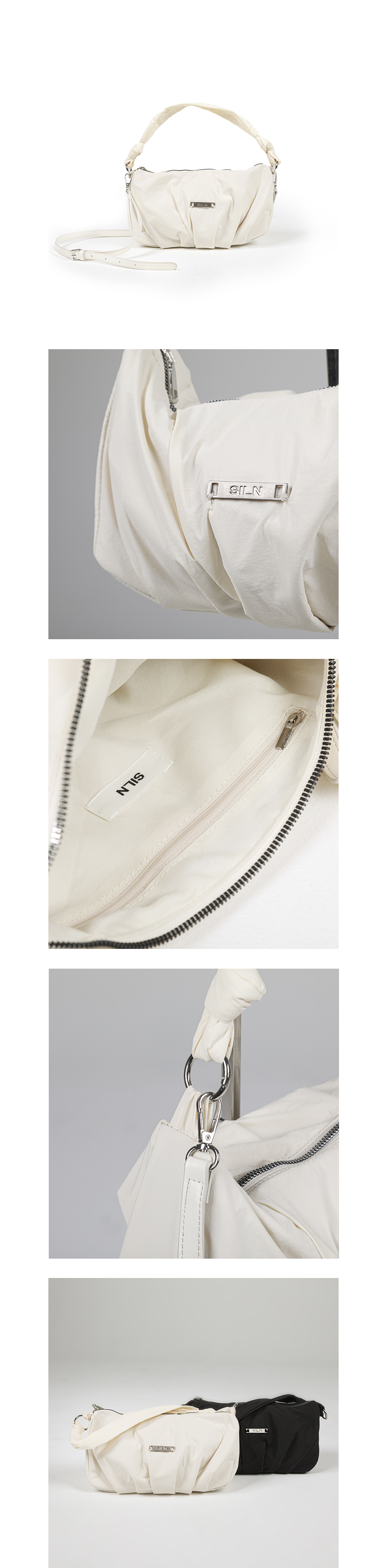 하단 셔링 디테일이 돋보이는 입체적인 호보백입니다. 짜임이 탄탄한 나일론 원단을 사용하였습니다. 조절과 탈부착이 가능한 긴 스트랩, 짧은 스트랩으로 구성되어 다양한 연출이 가능합니다. 내부에 작은 포켓이 있습니다. 금속 라벨로 포인트를 더하였습니다.