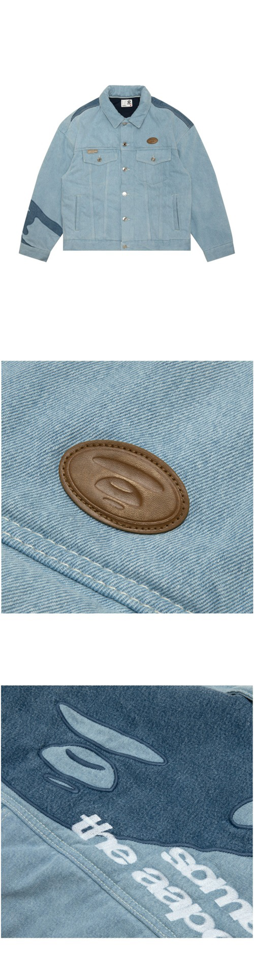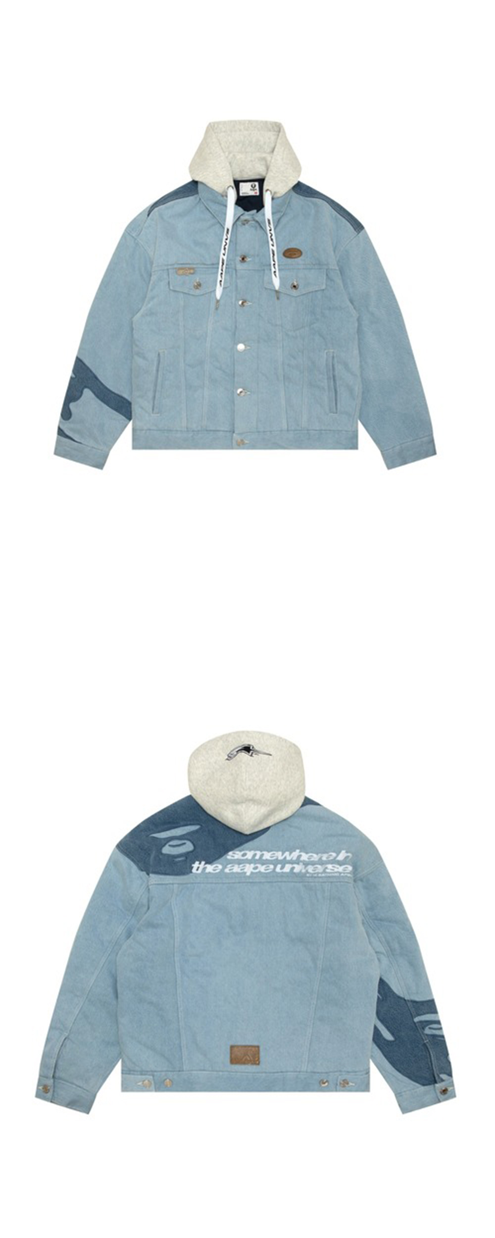 심플한 앞면과 대비되는 쿨한 무드의 뒷면이 매력적인 에이프의 메인 데님 자켓입니다. - 심플한 앞면 디자인 - 로고 및 에이프 헤드 자수로 스트릿한 뒷면 디자인 - 탈부착 가능한 후드 - 후드 중앙 및 스트링에 적용된 로고 디테일 - 내부에 안감이 있어 뛰어난 보온성 * 에이프 메인 우븐 팬츠 라이트 블루 컬러와 셋업으로 착용 가능