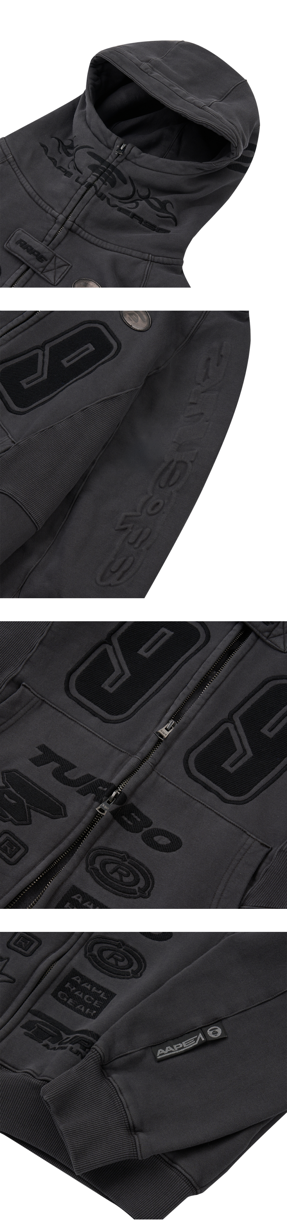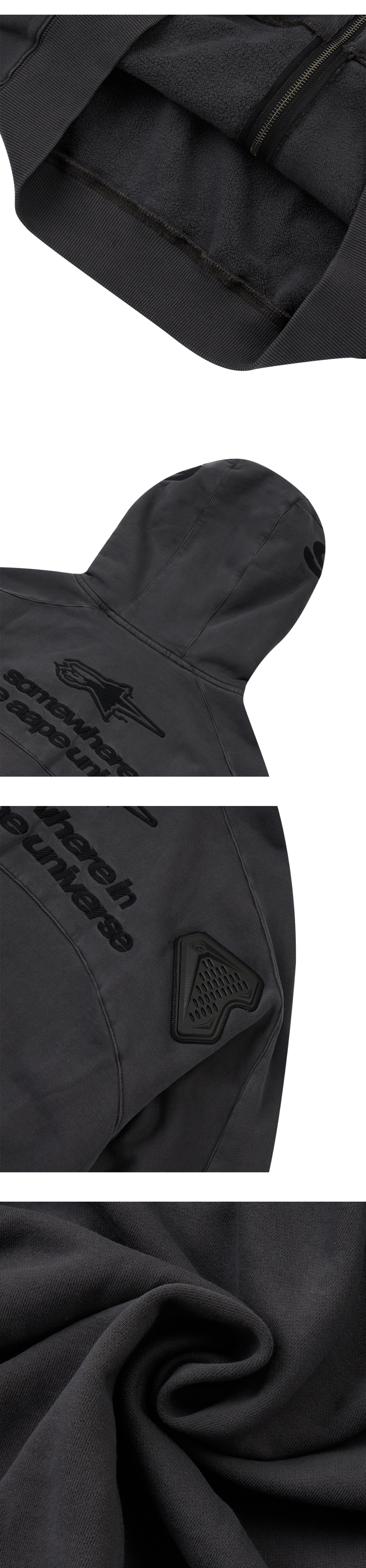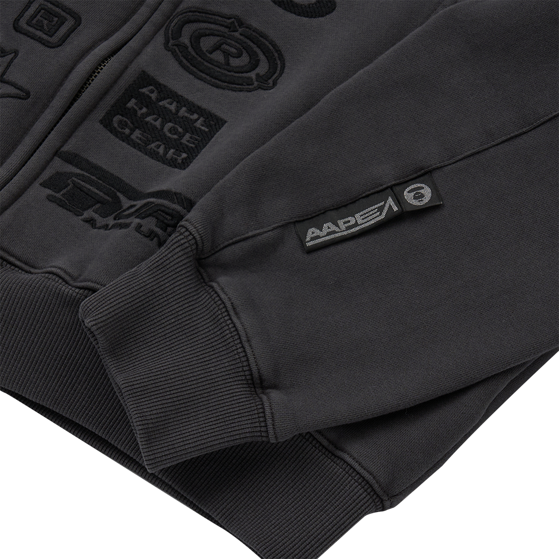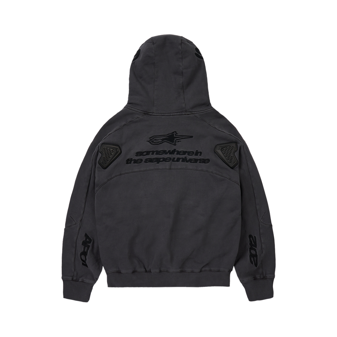 컬러부터 그래픽까지 올 블랙으로 시크한 무드를 나타내는 에이프의 메인 집업 스웨터 라이트입니다. - 후드 넥라인 그래픽 - 빈티지 워싱 - 백 및 심 포인트