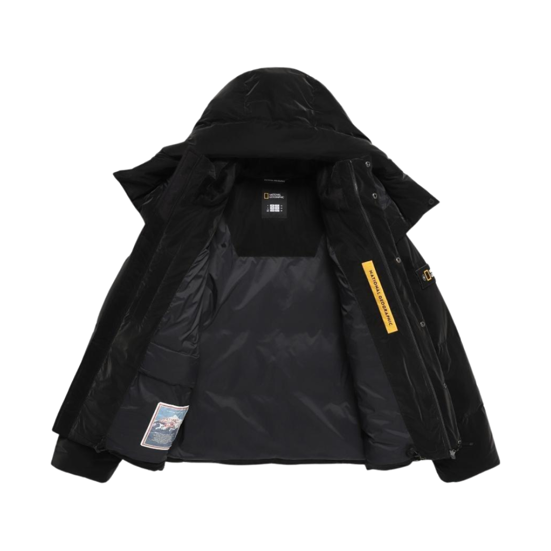 내셔널 지오그래픽 글로시 숏 렝스 후드 다운 점퍼 카본 블랙
