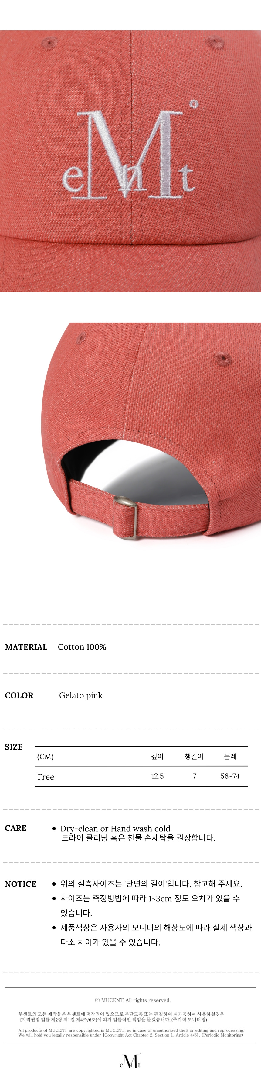 ┃Detail 볼캡에 로고를 넣을 때 무센트의 지향성과 세리프체와 잘 어울려서 폰트를 세 리프체로 채택했습니다. 세리프는 로마글 활자의 기둥의 양 끝을 맺는 돌출된 형태로 과거 로마 황제의 기념비에 새겨진 글자 모양을 다듬어 만든 고전적인 글자꼴에 기본을 두고 있습니다. 이 볼캡은 남녀공용으로 모두 착용할 수 있게 제작하려 했기 때문에 적당 한 깊이여야 했습니다. 우리의 볼캡은 깊이감이 깊습니다. 푹 들어가는 깊이 감 덕분에 눌러썼을 때의 모자 핏감, 그리고 적당히 긴 챙으로 얼굴이 작아보 이는 모자 핏이 무센트 볼캡만의 특징입니다. ┃Material : Cotton 100% ┃Care : Dry Cleaning ┃Made in China - 무센트는 말기의 행성인 이 지구에서 지속가능한 옷들을 고민합니다. 우리는 신념을 소비하는 미닝아웃을 지지합니다.