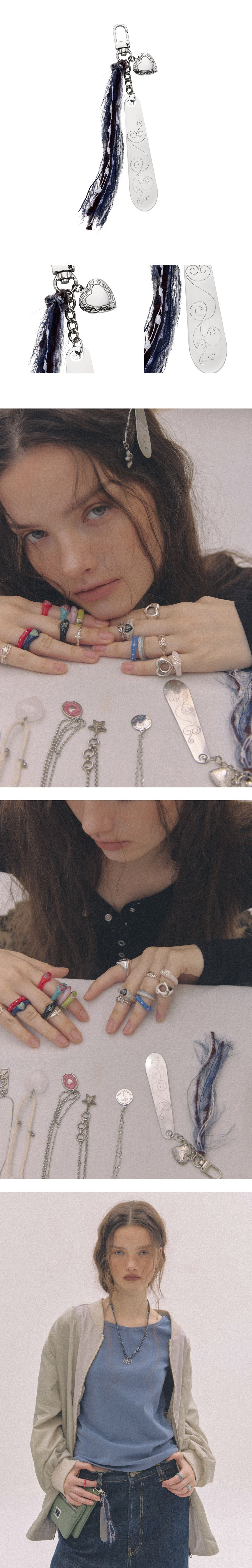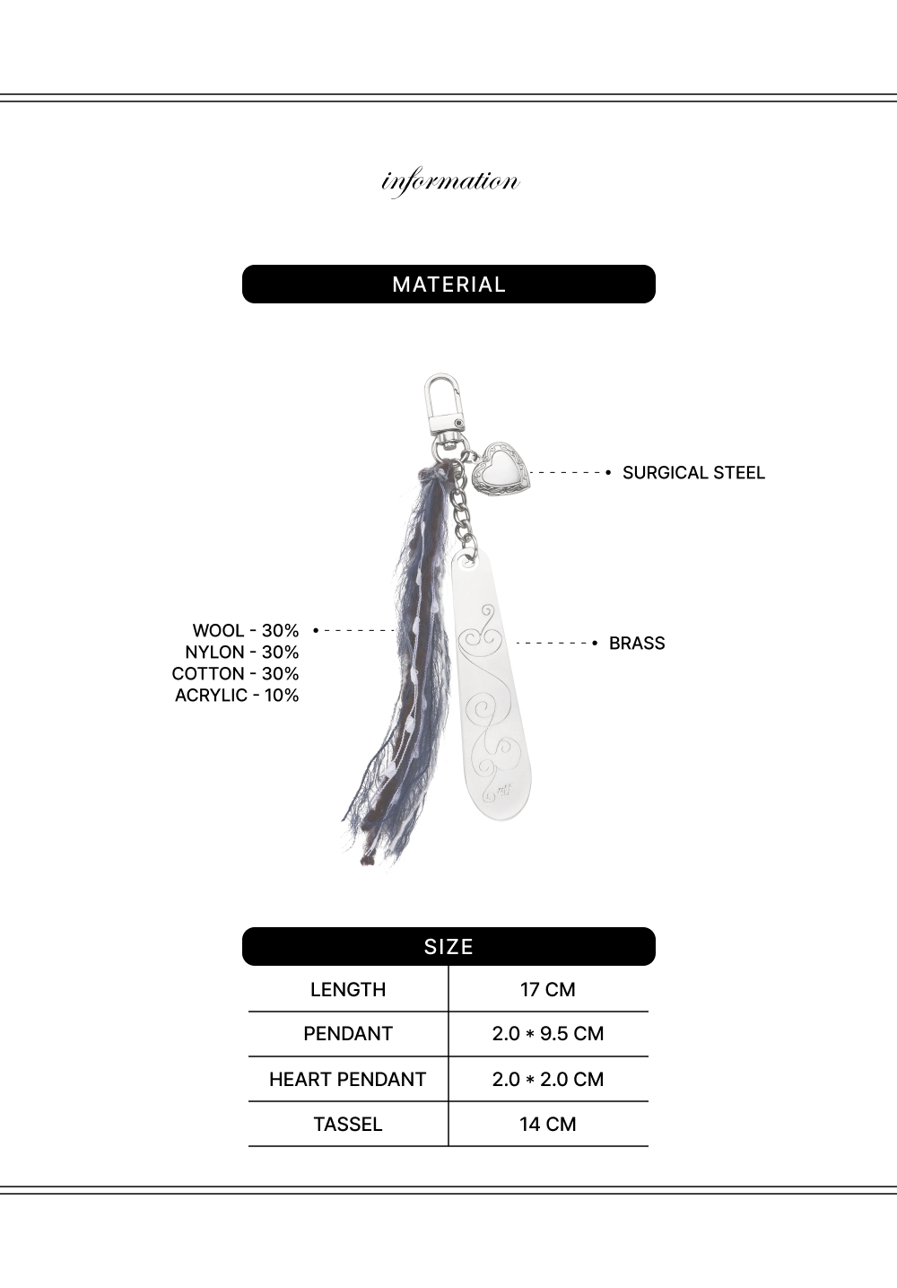 엔틱한 문양의 펜던트들과 부드러운 태슬이 유니크한 조화를 이루는 키링입니다. 의류나 가방에 잘 어울려 다양한 스타일링이 가능합니다.