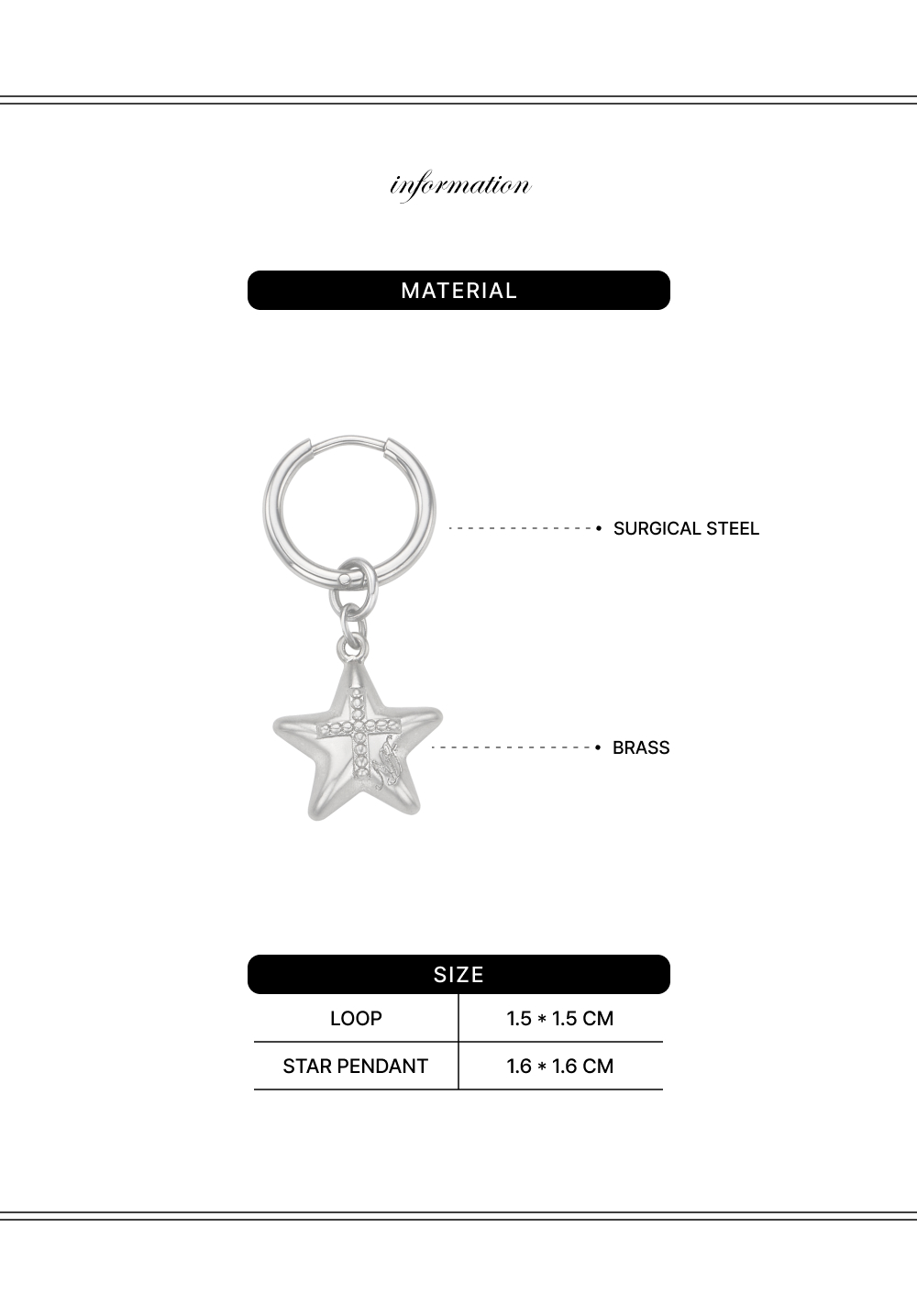 * 메탈 참이 달린 이어링으로 약간의 무게감이 느껴질 수 있습니다. 심플한 별 모양에 엔틱한 색감과 질감을 더해, 엔프프의 빈티지한 무드를 담은 이어링입니다. * 한 쌍이 아닌 한 개의 상품이니 구매 시 참고 바랍니다. *귀걸이 제품은 착용시 위생 상의 이유로 교환이나 반품이 불가능합니다.
