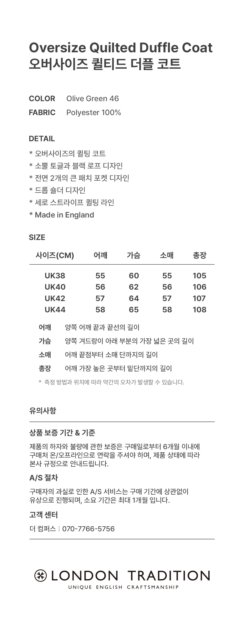런던 트레디션 오버사이즈 퀼티드 더플 코트 올리브 그린 46