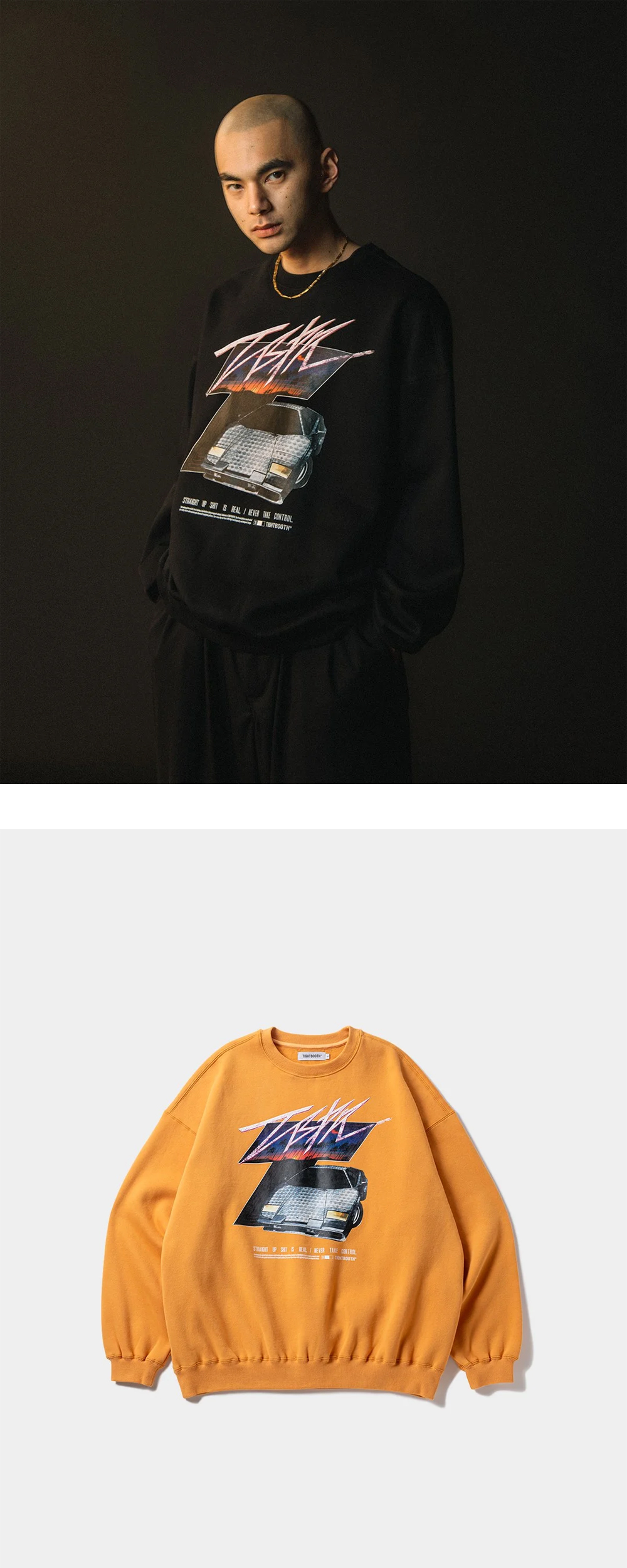 '관성 드리프트'로 잘 알려진 만화, '이니셜 D'를 연상시키는 타이트부스의 이니셜 T 크루 스웨트셔츠입니다. - 박시한 실루엣 - 브러시 처리된 10.5온스 코튼:폴리 50:50 혼방 원단 - 일본의 만화 '이니셜 D'를 패러디한 그래픽 프린팅 * 모델샷은 참고용으로, 동일 모델의 블랙 컬러입니다.