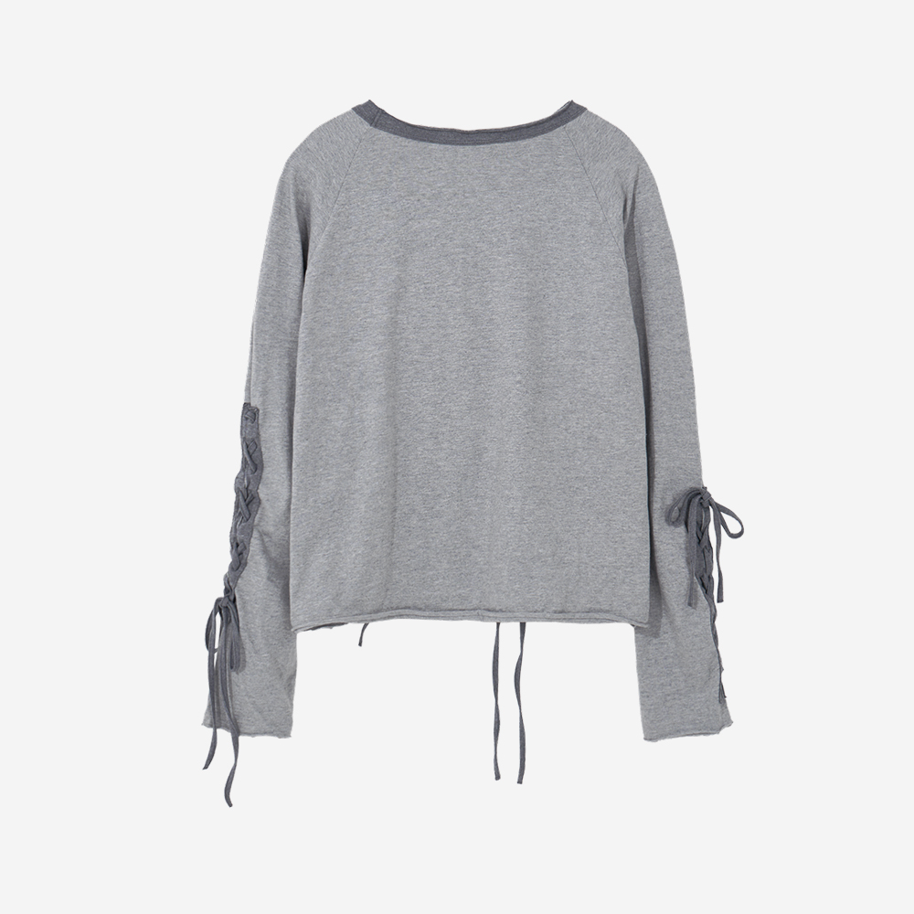 - 래글런 소매의 롱 슬리브 탑 - 전면, 소매 배색 레이스업 디테일 - 네크라인, 소매, 밑단 커팅 마감으로 러프한 데미지 디테일 - 부드러운 소재감 - 레귤러핏의 실루엣 * 174cm and she is wearing size 1 * Shell : 100% Cotton * Made in Korea
