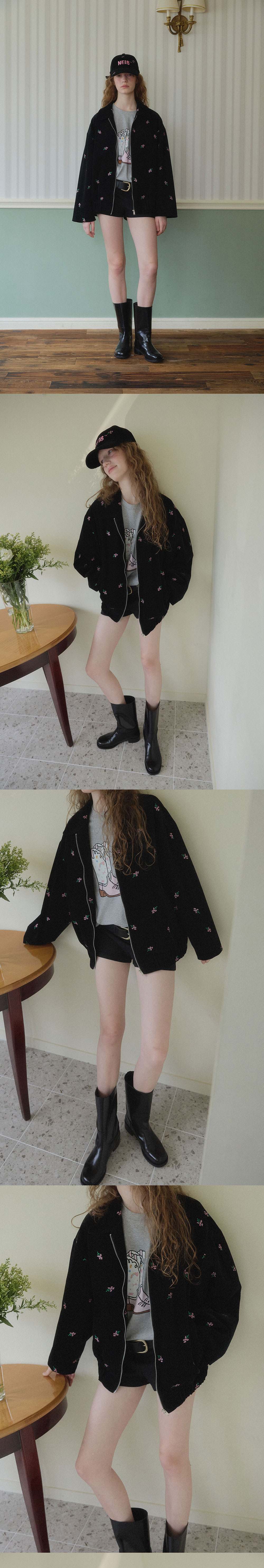 네이비 플로럴 엠브로이더리 오버사이즈 블루종 블랙