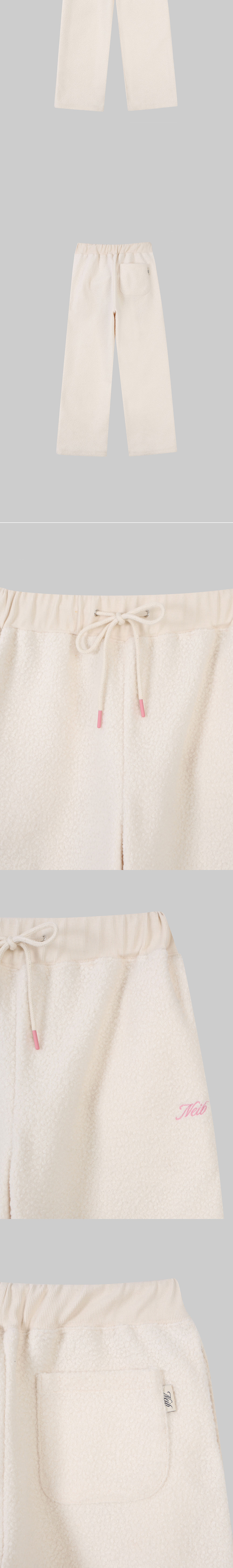 -볼륨이 느껴지는 시어링 소재 사용. -겉면 시어링 안쪽 후리스 소재의 패브릭으로 착용시 보온성은 물론 소프트한 터치감으로 편안한 착용감. -심플한 컬러웨이 구성으로 다양한 상의와 매치 가능. -WINTER에 착용 가능한 보온성이 뛰어난 팬츠. -밴딩 부분에서 사용한 아일렛,팁 부자재 디테일 컬러 코팅 진행.(핑크) -패브릭 특성상 포켓 부분 두꺼워지지 않도록 단면 후리스와 믹스하여 사용. -와이드한 기장감이 포인트지만 밴딩 부분의 연출에 따라 기장감이 달라질 수 있음. -Neib 시그니처 로고 자수. -FREE사이즈. -디테일컷이 실제컬러와 유사합니다.
