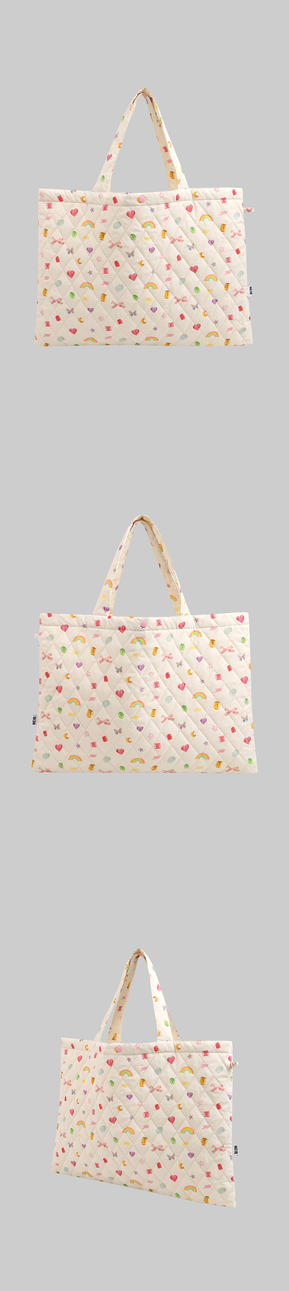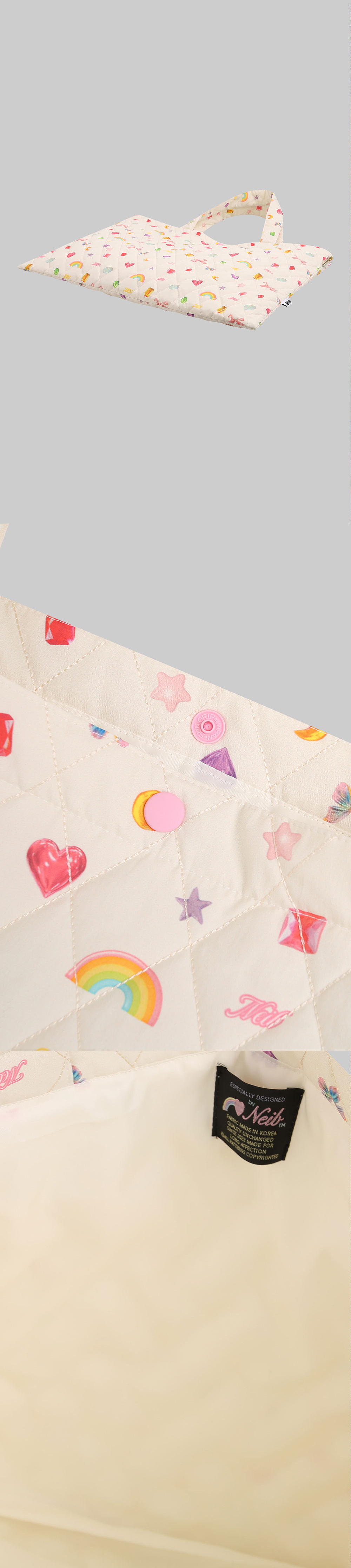 -네이비에서 자체 개발된 Exclusive 패턴 패브릭 생산. -일반 누비 스티치가 아닌 하트와 다이아몬드 모양 따라 '자수' 누비 스티치 진행. -무게감과 보온성의 균형을 위해 3온스 압축 퀼팅 방식을 선택. -가벼운 무게에 비해 보온성을 가지고 있어 늦가을 들기 좋은 제품. -과장된 사이즈의 룩북컷 보다 줄여서 메인제품 진행. -큰 사이즈의 빅백으로 수납공간 충분한 장점. -빅백 사이드 부분 고리 디테일 있어 키치한무드의 키링도 함께 연출 가능. -포켓 없음. -FREE사이즈. -디테일컷이 실제컬러와 유사합니다. NYLON 100% size (cm) 가로 세로 끈길이 FREE 59 43 53 MODEL SIZE Height 176cm Bust 32.5cm Waist 25cm Hips 34.5cm