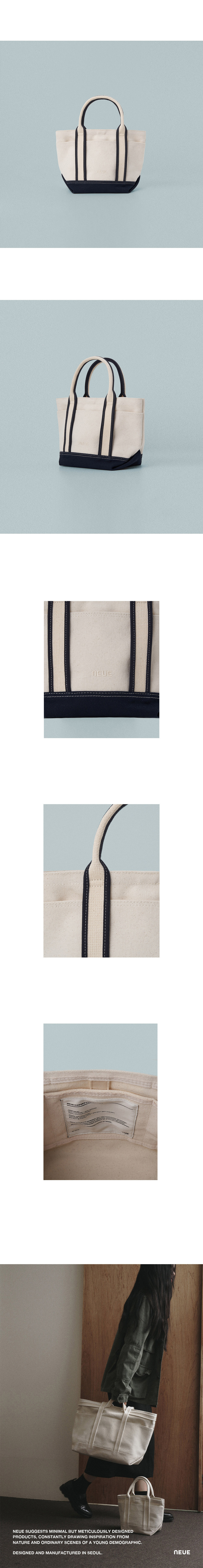 - 자연스러운 워싱질감과 탄탄한 내구성의 캔버스 원단 - 바이어스로 포인트를 준 손잡이 디테일 - 외부 포켓1 내부포켓3 - 가방의 여밈이 가능한 똑딱이 스냅 - neue 로고 자수