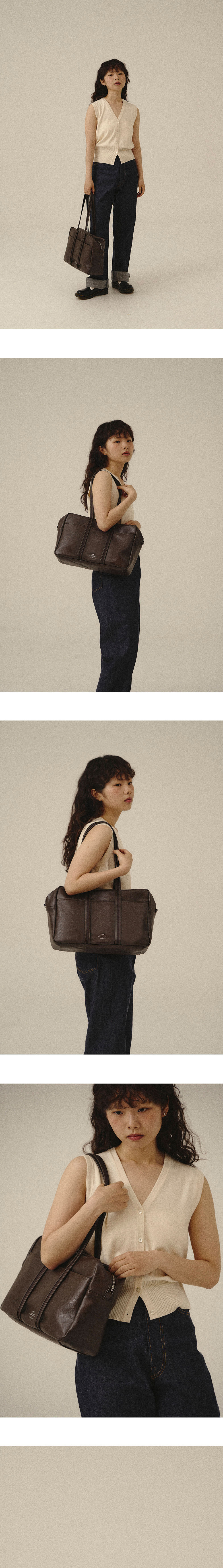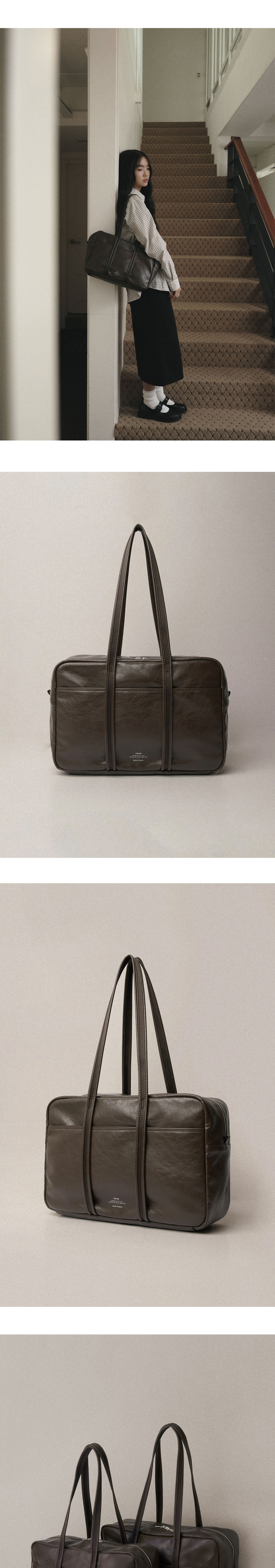 - 자연스러운 크랙과 소프트한 질감의 artificial leather - 은은한 광택감의 2way 실버 지퍼 - 가죽으로 바이어스한 어깨 스트랩 디테일 - 밀도 높은 폴리 안감과 외부 포켓1 내부 포켓3 - 바닥면 포켓에 자유롭게 넣었다 뺄 수 있는 하드한 보강재 - 노이에 로고 각인 - 재사용이 가능한 코튼백 포장