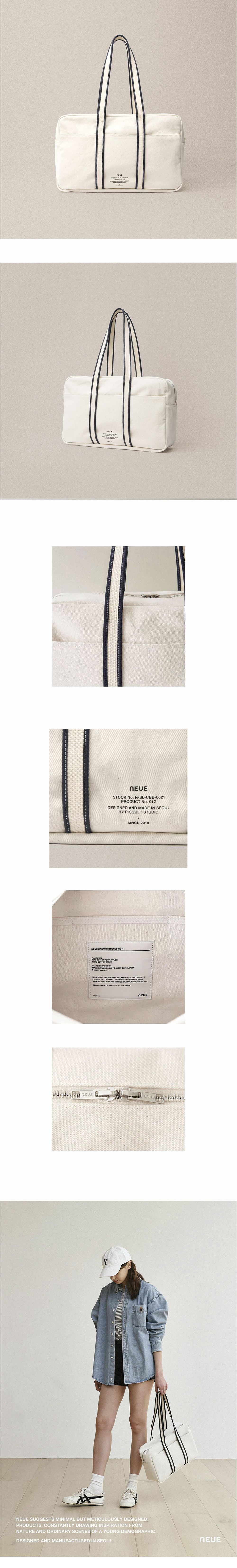 - 바이어스로 포인트를 준 어깨끈 디테일 - 내부의 3개의 포켓과 외부의 포켓 - 자연스러운 워싱질감과 탄탄한 내구성의 캔버스 원단 - neue 타이포 프린팅 - 은은한 광택감의 2way 실버 지퍼