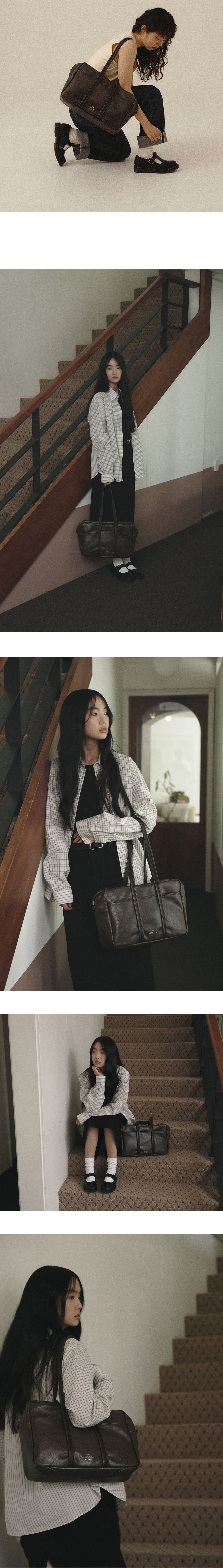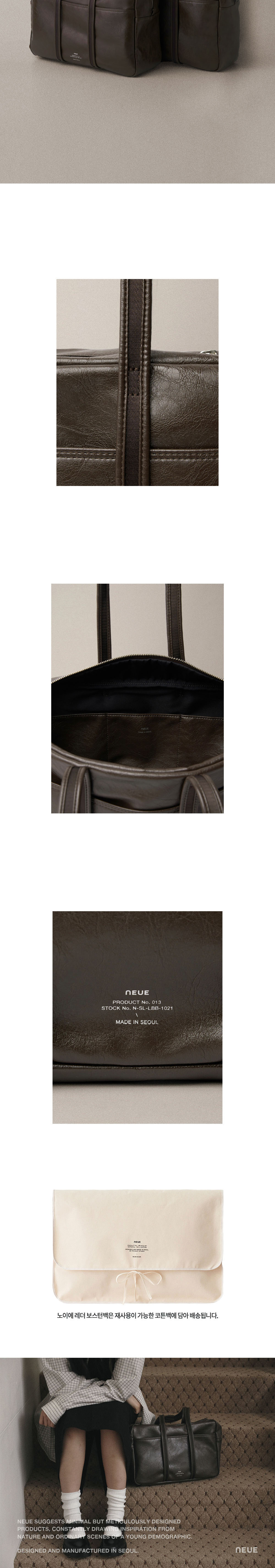 - 자연스러운 크랙과 소프트한 질감의 artificial leather - 은은한 광택감의 2way 실버 지퍼 - 가죽으로 바이어스한 어깨 스트랩 디테일 - 밀도 높은 폴리 안감과 외부 포켓1 내부 포켓3 - 바닥면 포켓에 자유롭게 넣었다 뺄 수 있는 하드한 보강재 - 노이에 로고 각인 - 재사용이 가능한 코튼백 포장