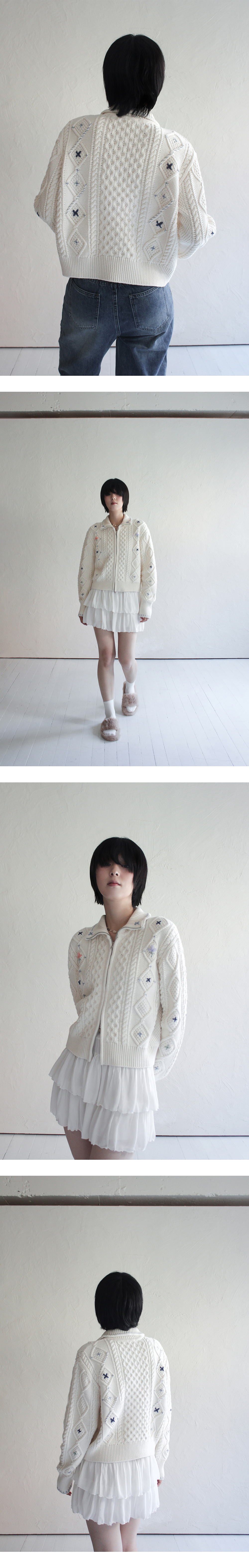 Rubati Alps Knit Zip-up Cardigan Flower Stitched by Hand Ivory