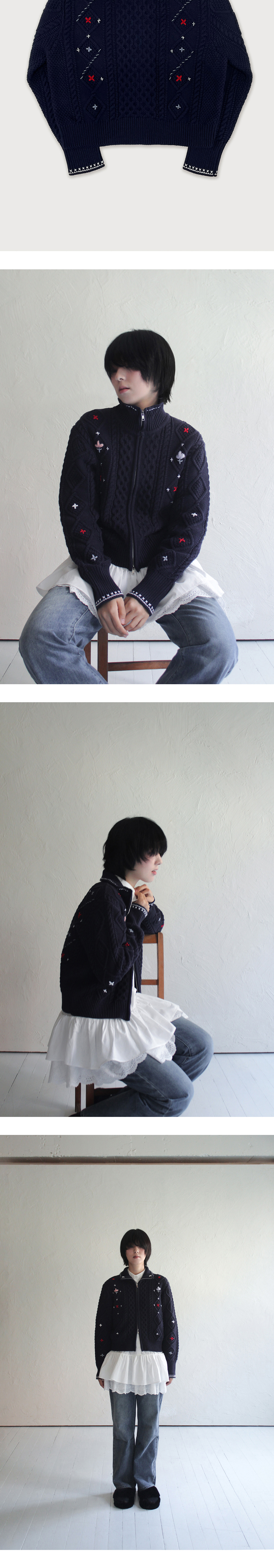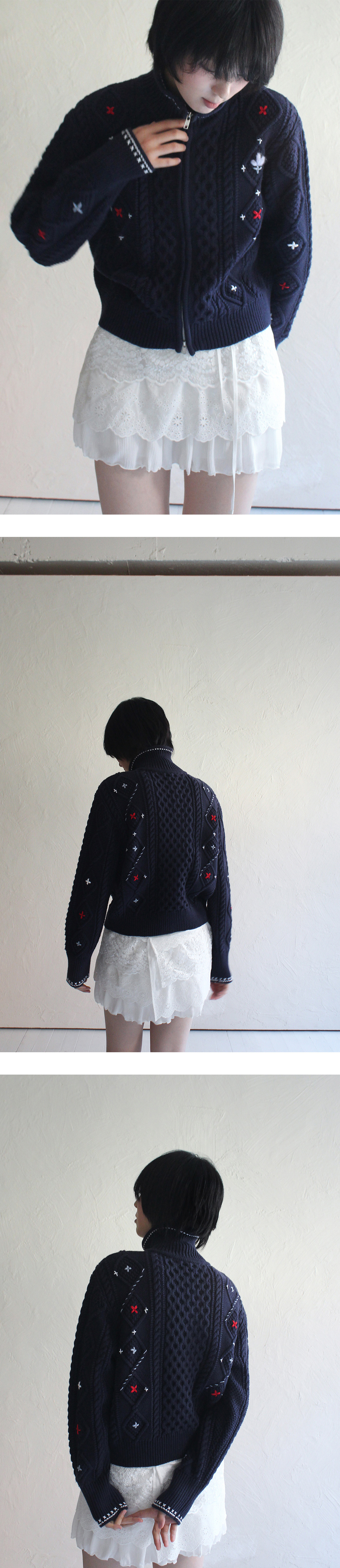 Rubati Alps Knit Zip-up Cardigan Flower Stitched by Hand Navy