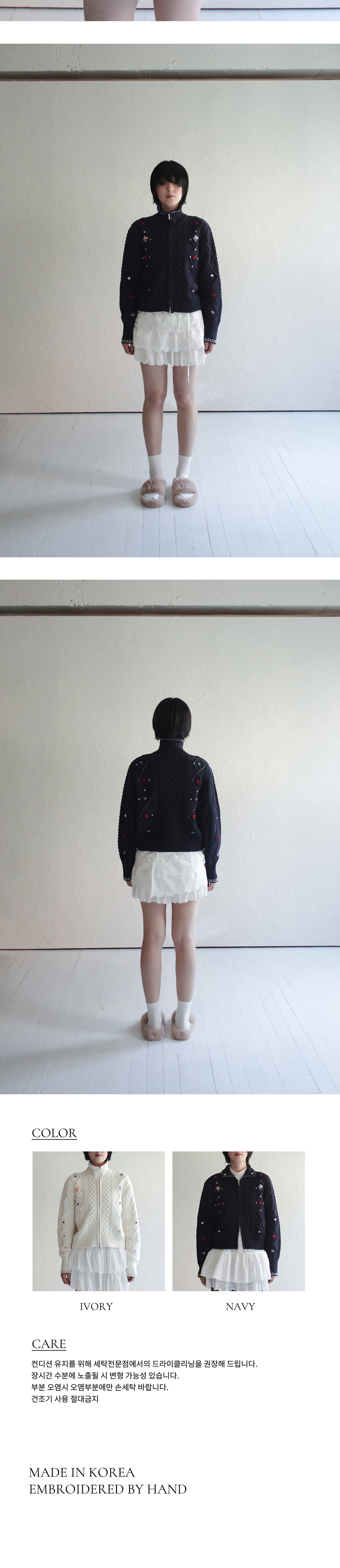 루바티 알프스 꽃자수 핸드스티치 니트 집업 가디건 네이비