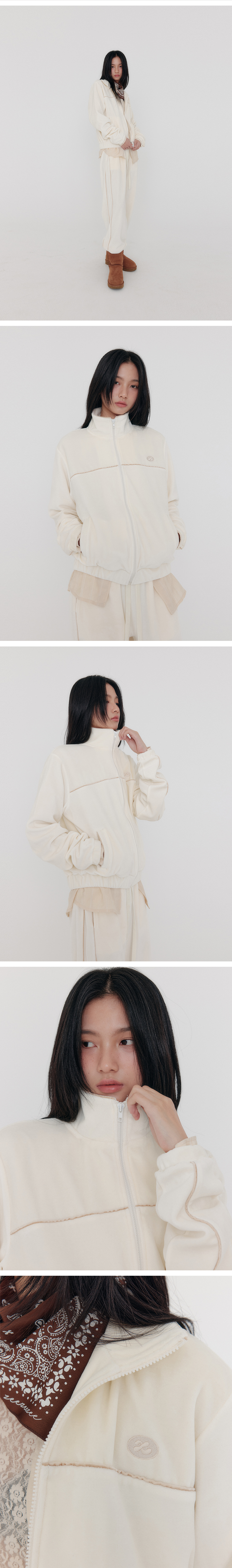 포근한 벨루어 소재에 벨벳 파이핑 디테일의 아우터 - 소프트한 터치의 벨루어 원단 - 벨벳 파이핑 디테일 - 소매단, 밑단 밴드 - 가슴부분 심볼 자수 - 부드러운 비슬론 지퍼 비침 없음 / 신축성 보통 / 두께감 보통