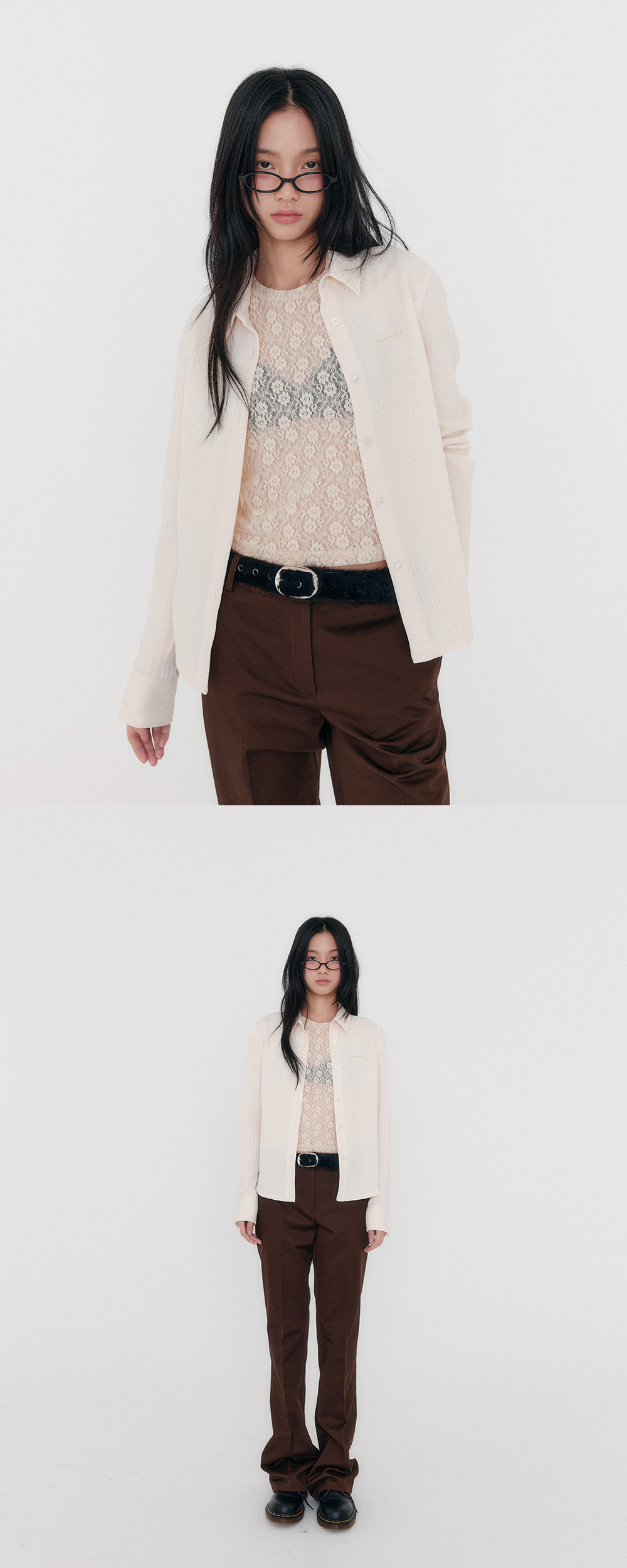 스트레치 코튼 소재 링클 텍스쳐의 슬림핏셔츠 - 텐션감있는 코튼 소재로 편안한 착용감 - 가슴다트와 뒷다트라인으로 슬림한 실루엣 - 앞판 매칭컬러 로고 자수 - 천연자개단추 비침 보통 / 신축성 보통 / 두께감 보통