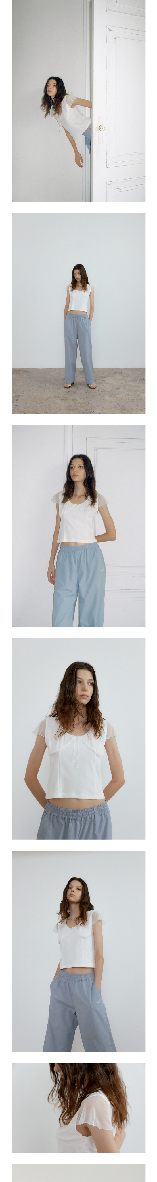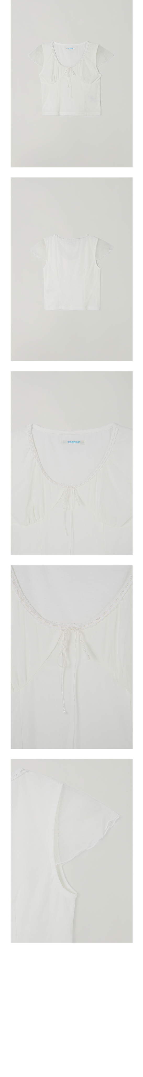 부드럽고 시원한 터치감으로 한 여름에도 편안한 착용감을 선사하는 U넥 라인의 터널 레이스 티셔츠입니다. 코튼 모달 혼방 원단에 스판이 함유되어 바디라인을 아름답게 형성해주며 바스트 절개 라인의 셔링 디테일은 부담없는 포인트로 만들어주었습니다. 퓨어한 원단 느낌에 쉬어한 플레어 캡소매 디자인으로 완성하여 특별한 날 드레스 업 하기에 좋습니다. 수입 레이스(made in japan)로 전체 트리밍 한 넥라인 사이사이에는 얇은 실크 스트링(made in japan)을 넣어 자유롭게 리본 타이로 스타일링 할 수 있습니다. 넥 라인의 레이스 트리밍은 원단에 비해 도톰하여 체형에 따라 안 쪽으로 말리는 현상이 있으며, 넥 라인 부근에 자연스럽게 주름이 잡혀집니다.