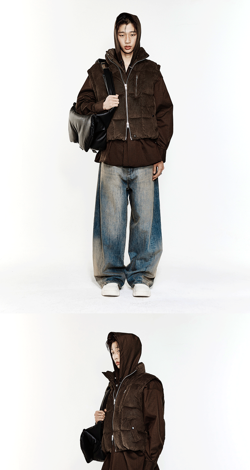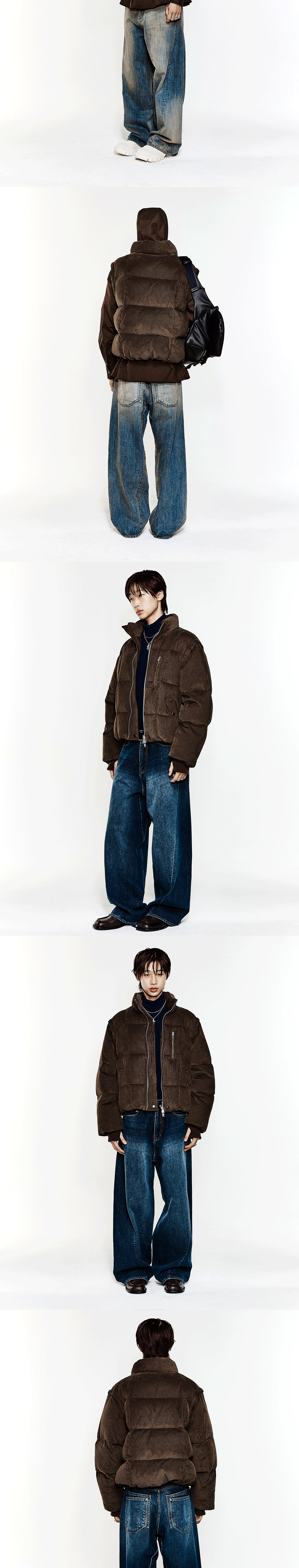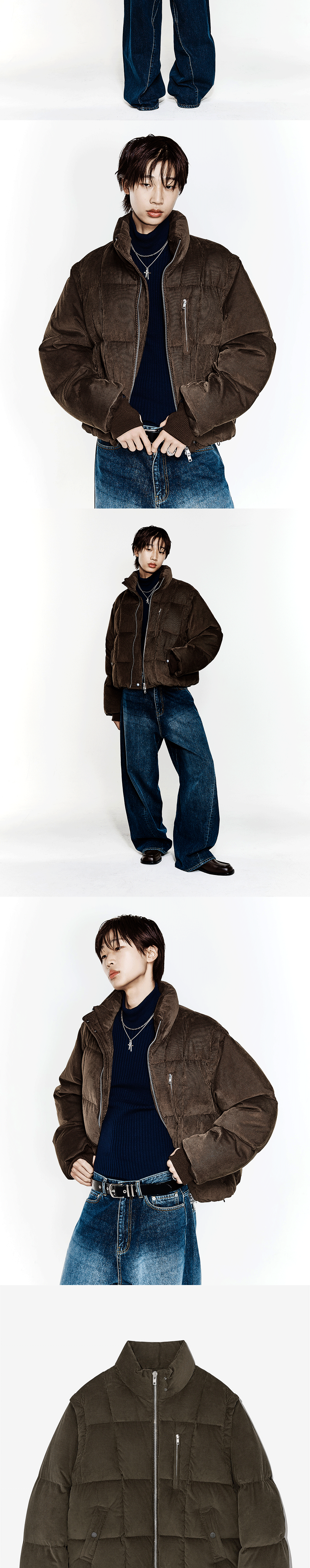 부드러운 터치감과 은은한 광택감의 코듀로이 소재로 제작된 미드넥 패딩입니다. 계절감을 살린 소재와 소매 탈부착 형태로 활용도를 높였으며, 덕 다운 충천재로 풍성한 볼륨감 및 크롭한 기장감으로 트렌디하면서 편하게 착용 가능합니다. -DETAIL- 소매 탈부착 가능 절개와 퀼팅을 활용한 입체적 실루엣 밑단 조절이 가능한 드로우스트링 스냅 버튼 플라켓 소매 핑거홀 디테일 -model- 187cm / 가슴둘레 91cm / 허리둘레 69cm / 엉덩이둘레 87cm - 2사이즈 착용