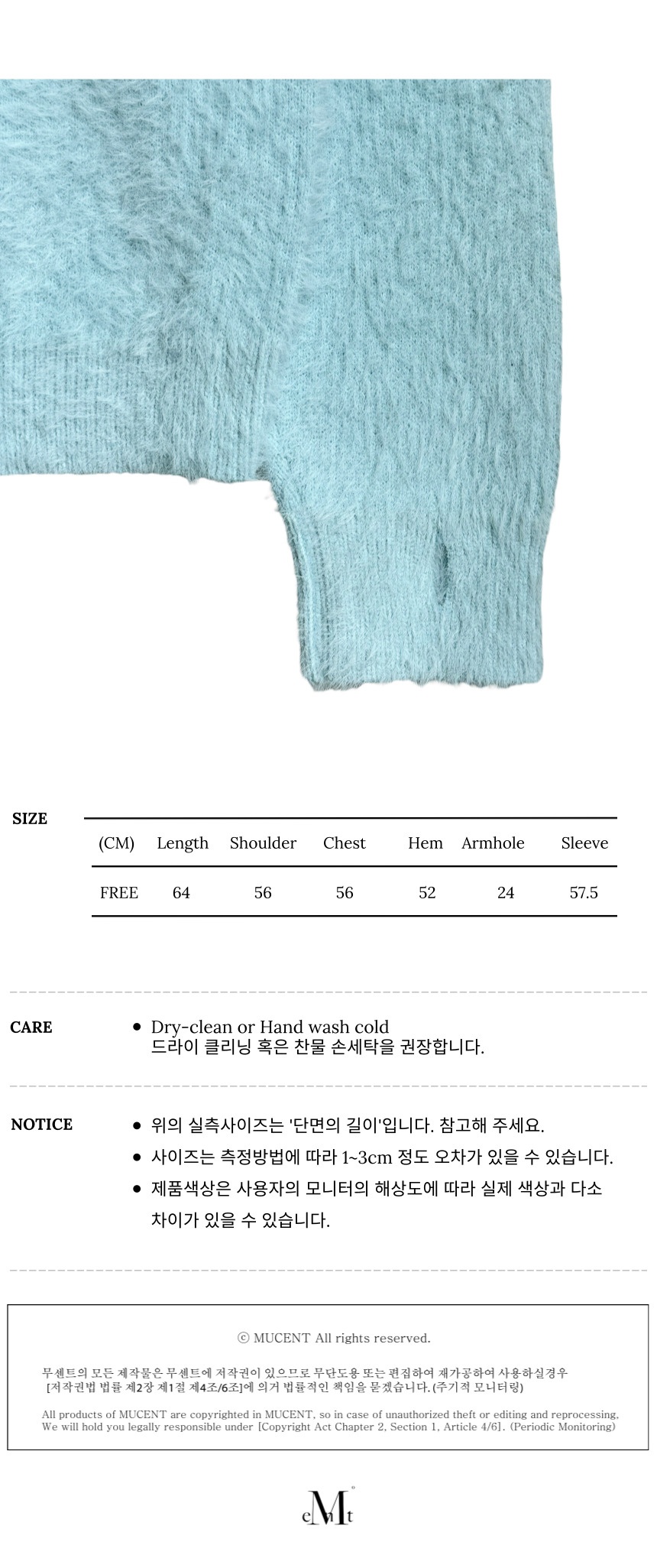 ┃Detail • 무센트 시그니처 자수 로고 • 루즈한 아웃핏의 앙고라 니트 • 소매부분 핸드 워머 디테일 • 털빠짐 최소화 공정을 거친 원단 • 고중량 원사 특유의 보온성과 보드라운 터치감 • 포근하고 자연스럽게 떨어지는 루즈핏 실루엣 • 부드럽고 화사한 파스텔톤 색감 ┃Material : Poly 100% ┃Care : Dry cleaning - 무센트는 말기의 행성인 이 지구에서 지속 가능한 옷들을 고민합니다. 우리는 신념을 소비하는 미닝아웃을 지지합니다.