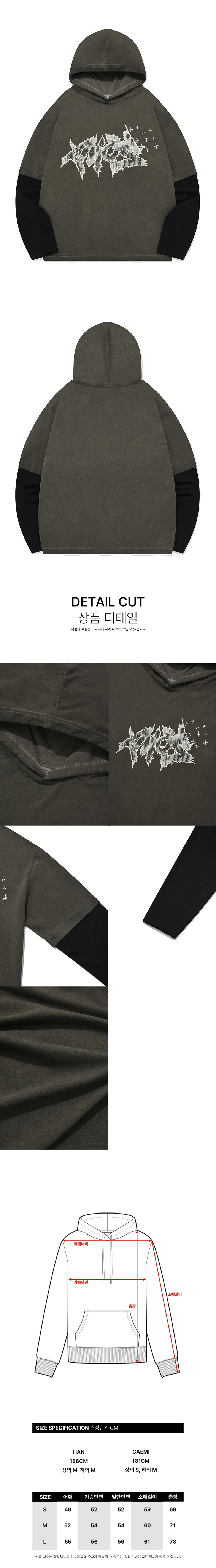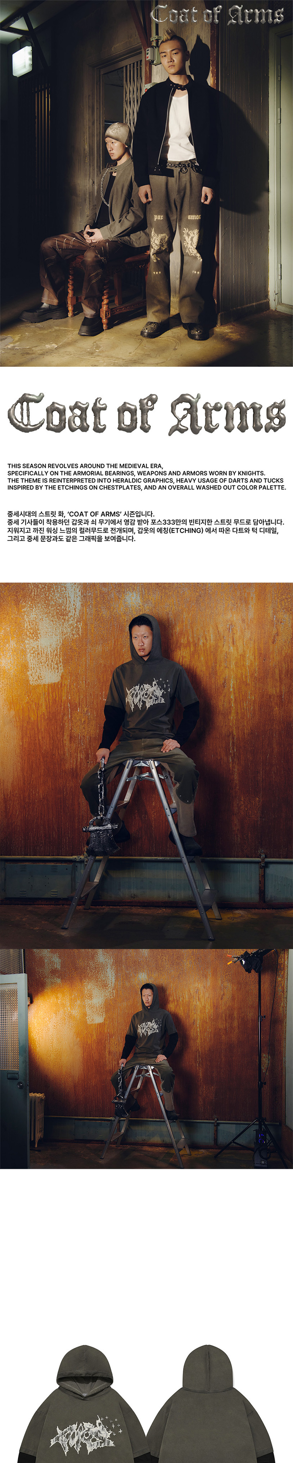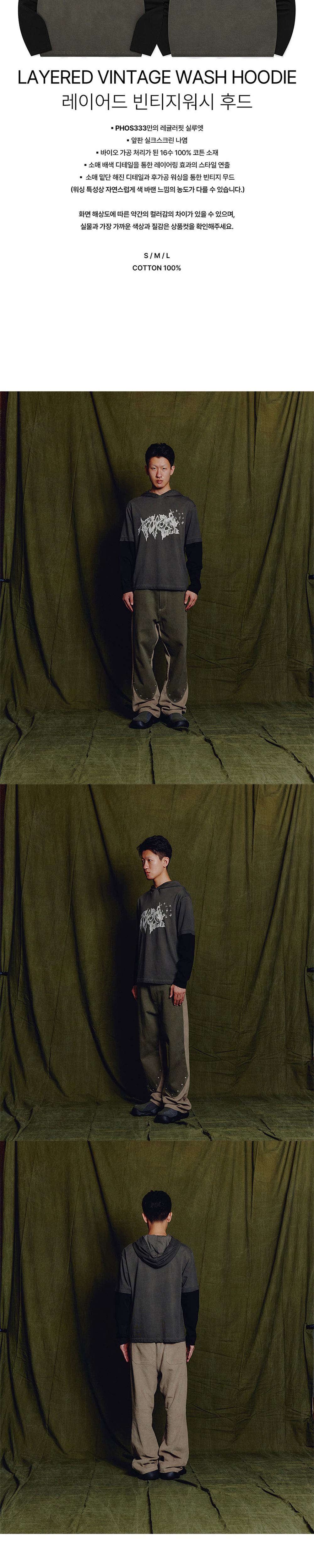 PHOS333만의 스탠더드 레귤러 실루엣 앞판 실크스크린 나염 바이오 가공 처리가 된 16수 100% 코튼 소재 소매 배색 디테일을 통한 레이어링 효과의 스타일 연출 소매 밑단 해진 디테일과 후가공 워싱을 통한 빈티지 무드