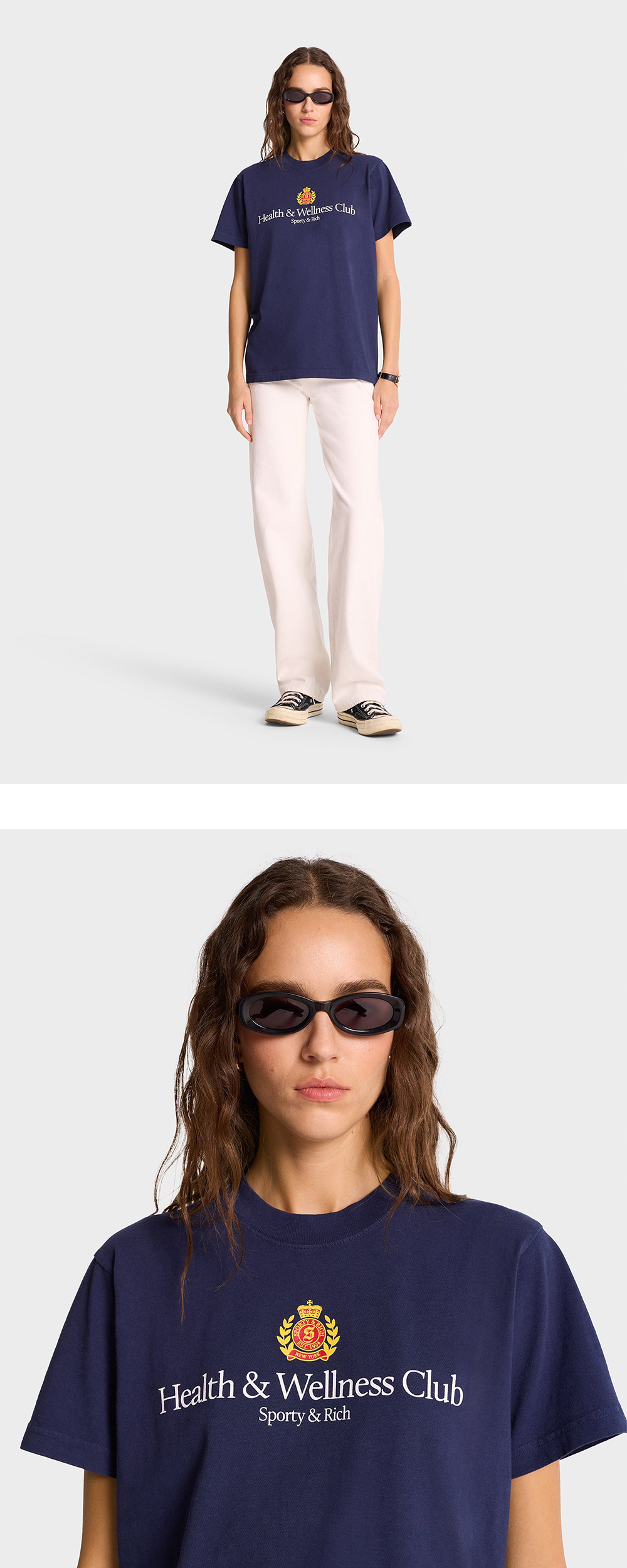 딥한 네이비 컬러에 더해진 세련된 프린팅이 고급스러운 분위기를 자아내는 스포티 앤 리치의 H&W 크레스트 티셔츠입니다. - 6.5온스 USA 코튼 100% - 약간 오버한 핏 - 전면 로고 프린팅 - 가먼트 다잉 - Shrink Free * 유니섹스 디자인으로, 여성은 한 사이즈 다운 권장 * 모델: 178cm, S사이즈 착용