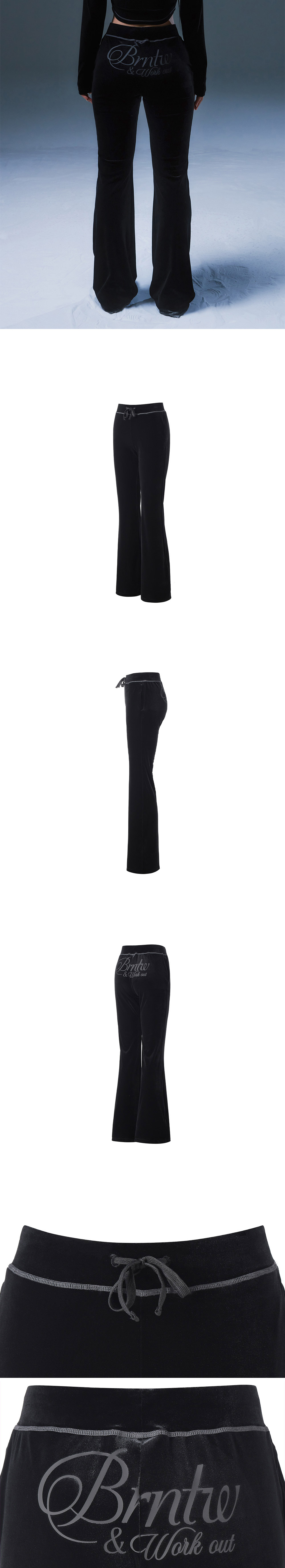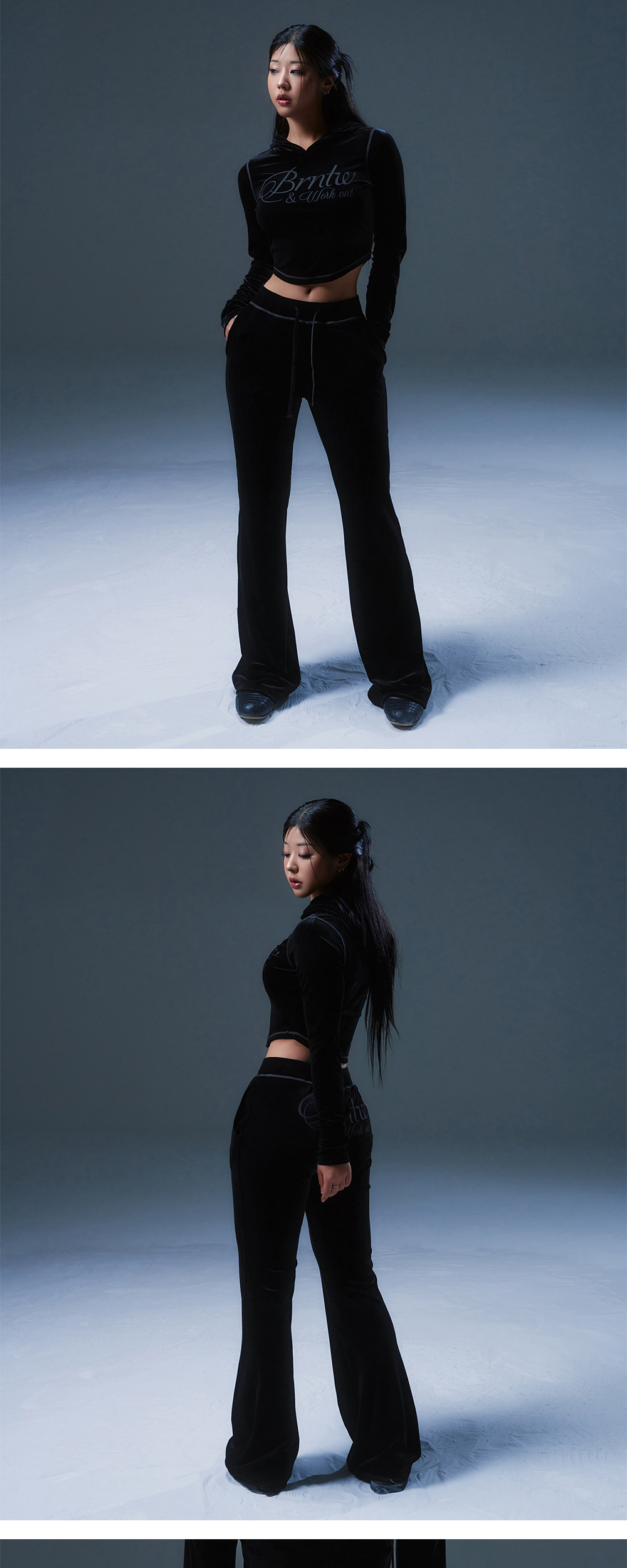 [DETAILS] * 벨루어 부츠컷 팬츠 - 소프트 벨벳 스판 원단 - Flocking 레터링 로고 - 배색 스티치 포인트 - 슬림핏 Material : POLYESTER 90%, POLYURETHANE 10% Fitting : NH 2 Size, 162cm, 46kg